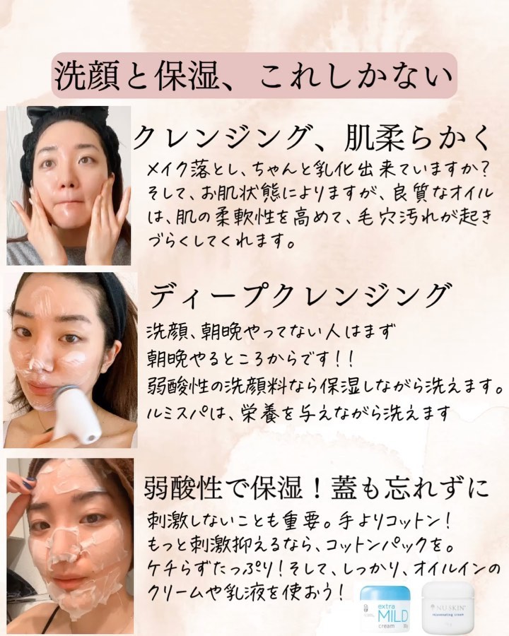 小鼻を蒸す 3.オイル塗る 4.ラップする 5.再び小鼻を蒸す 6.洗い流して洗顔する 脂は油によって制する!ということでちょっと一手間を加える夜ルーティンです。 私は、4つの植物油から出来てる優しいクレンジングオイルでやっているので、ただのオイルは使ってないのですが