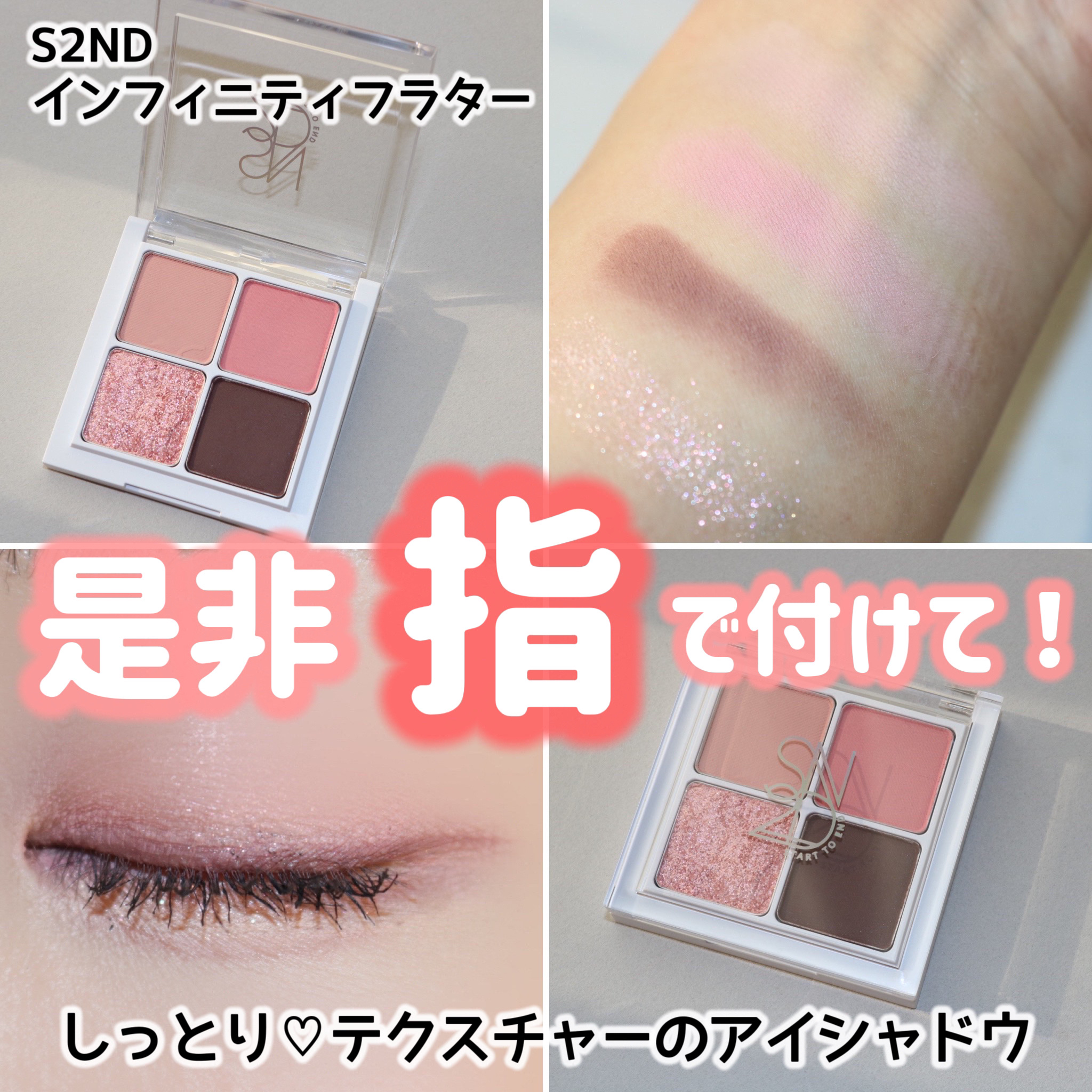 - 無限に煌めくワンタッチテクスチャー。 パーソナルカラーやなりたい印象に合わせて色を選べるアイシャドウパレット「S2ND エスツーエンディー インフィニティフラター」。 スフレのような軽い付け心地。 ひと塗りで均一に広がる柔らかテクスチャーで鮮やかに発色。 粉・ラメ飛びしにくい! 密着感が良く粉飛びを防いでヨレにくいから塗りたての発色が長続き! 捨て色のない4色パレットでメイク初心者でも簡単にアイメイクを楽しめるマルチカラー。