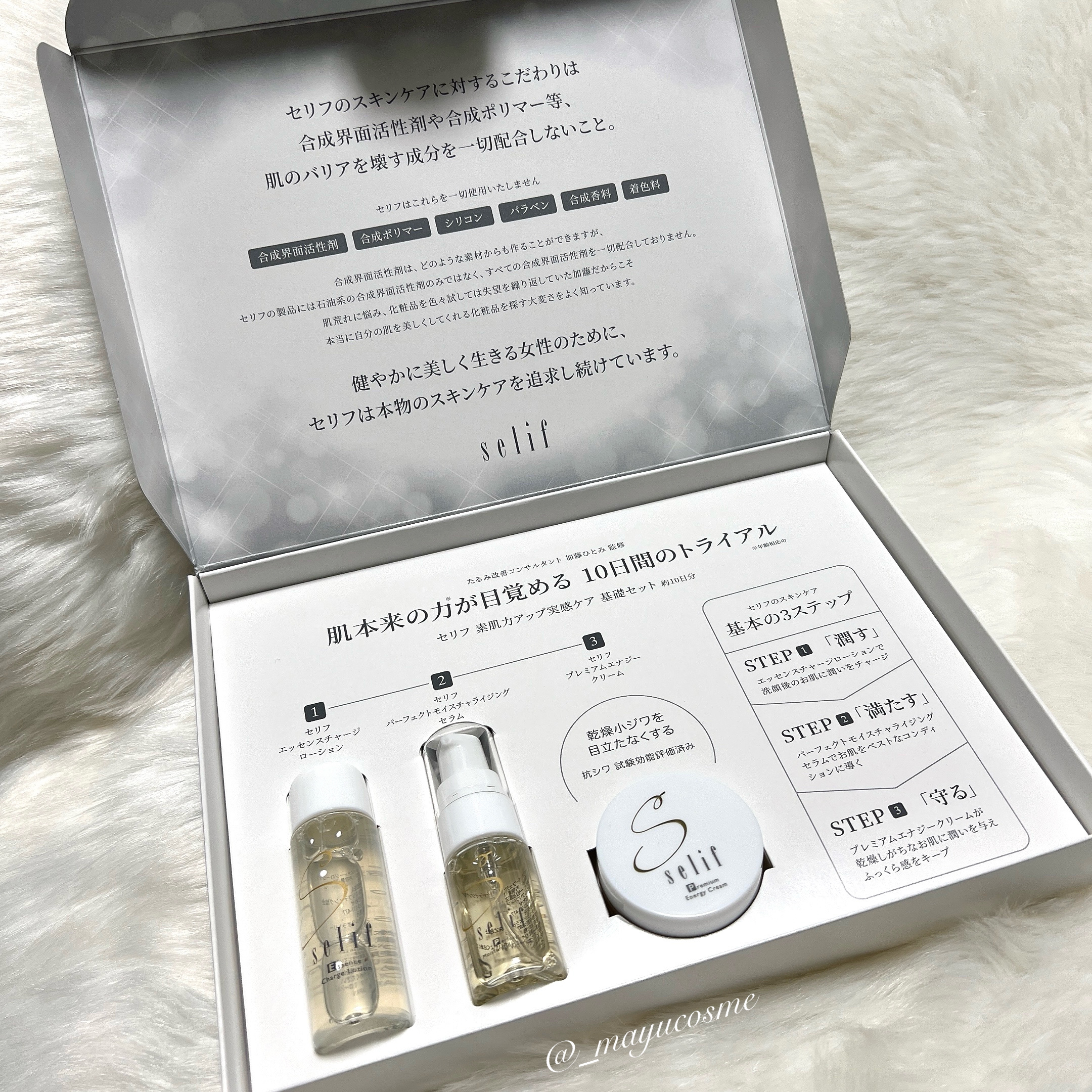 敏感肌の方でも使いやすいシンプルで効果的なスキンケアセット。中身はローション・セラム・クリームのミニボトルがinされた充実の内容です。 合成界面活性剤完全無添加・合成ポリマー、パラベン完全無添加。高機能成分の《センチペタクンニンガミー》が肌へ多方面からアプローチします。 私は特にクリームのしっとりしたコクが気に入りました。ほどよい固さで肌にぴたっと密着してくれる感じが心強いです。