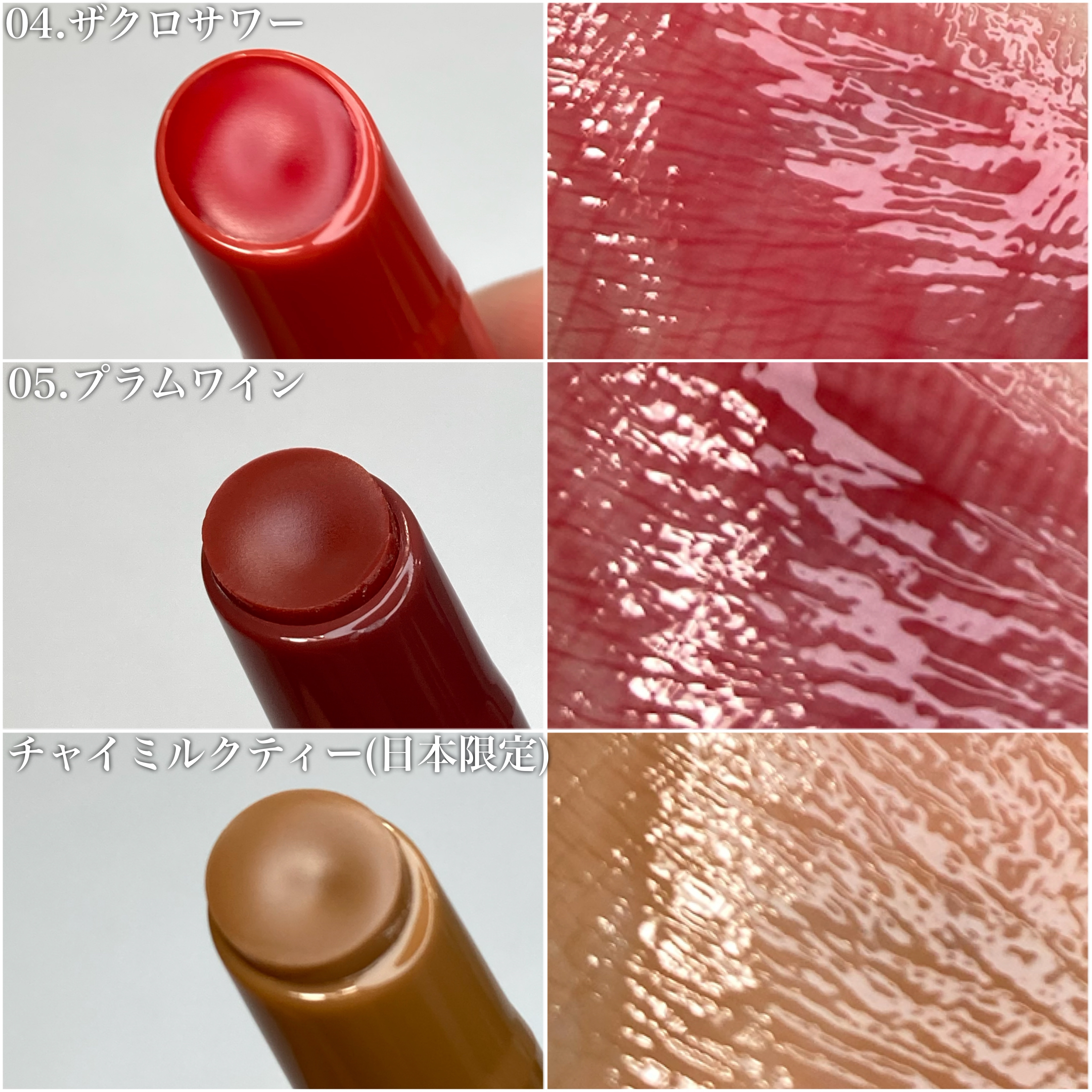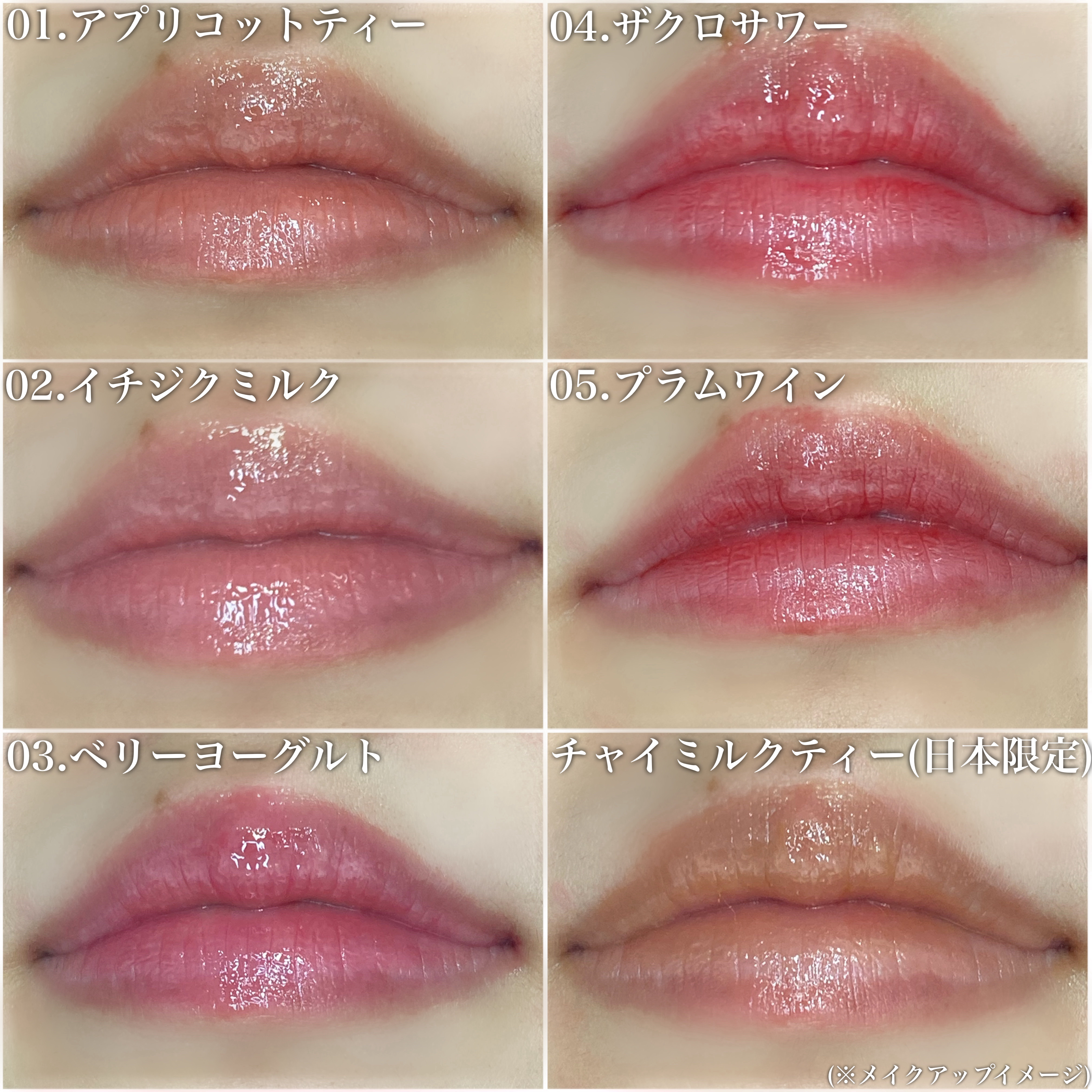 - <01 アプリコットティー> リンゴ酸ジイソステアリル、ダイマージリノール酸ダイマージリノレイルビス(ベヘニル/イソステアリル/フィトステリル)、ビスジグリセリルポリアシルアジペート-2、トリイソステアリン酸ポリグリセリル-2、水添ポリイソブテン、パラフィン、マイクロクリスタリンワックス、ウルシ果皮ロウ、ハチミツエキス、センチフォリアバラ花エキス、マンゴー果実エキス、カニナバラ果実エキス、アーモンド油、アルガニアスピノサ核油、アンズ核油、オリーブ果実油、シア脂、ツバキ種子油、ホホバ種子油、月見草油、BG、トリ(カプリル酸/カプリン酸)グリセリル、1,2-ヘキサンジオール、イソステアリン酸ソルビタン、酢酸トコフェロール、フェノキシエタノール、酸化鉄、酸化チタン、赤202、香料 <02 イチジクミルク> リンゴ酸ジイソステアリル、ダイマージリノール酸ダイマージリノレイルビス(ベヘニル/イソステアリル/フィトステリル)、ビスジグリセリルポリアシルアジペート-2、トリイソステアリン酸ポリグリセリル-2、水添ポリイソブテン、パラフィン、マイクロクリスタリンワックス、ウルシ果皮ロウ、ハチミツエキス、センチフォリアバラ花エキス、マンゴー果実エキス、カニナバラ果実エキス、アーモンド油、アルガニアスピノサ核油、シア脂、オリーブ果実油、アンズ核油、ツバキ種子油、ホホバ種子油、月見草油、BG、トリ(カプリル酸/カプリン酸)グリセリル、1,2-ヘキサンジオール、イソステアリン酸ソルビタン、酢酸トコフェロール、フェノキシエタノール、酸化鉄、酸化チタン、赤202、青1、香料 <03 ベリーヨーグルト> リンゴ酸ジイソステアリル、ダイマージリノール酸ダイマージリノレイルビス(ベヘニル/イソステアリル/フィトステリル)、ビスジグリセリルポリアシルアジペート-2、トリイソステアリン酸ポリグリセリル-2、水添ポリイソブテン、パラフィン、マイクロクリスタリンワックス、ウルシ果皮ロウ、ハチミツエキス、センチフォリアバラ花エキス、マンゴー果実エキス、カニナバラ果実エキス、アーモンド油、アルガニアスピノサ核油、シア脂、オリーブ果実油、アンズ核油、ツバキ種子油、ホホバ種子油、月見草油、BG、トリ(カプリル酸/カプリン酸)グリセリル、1,2-ヘキサンジオール、イソステアリン酸ソルビタン、酢酸トコフェロール、フェノキシエタノール、酸化鉄、酸化チタン、赤202、黄5、香料 <04 ザクロサワー> リンゴ酸ジイソステアリル、ダイマージリノール酸ダイマージリノレイルビス(ベヘニル/イソステアリル/フィトステリル)、ビスジグリセリルポリアシルアジペート-2、トリイソステアリン酸ポリグリセリル-2、水添ポリイソブテン、パラフィン、マイクロクリスタリンワックス、ウルシ果皮ロウ、ハチミツエキス、センチフォリアバラ花エキス、マンゴー果実エキス、カニナバラ果実エキス、アーモンド油、アルガニアスピノサ核油、シア脂、オリーブ果実油、アンズ核油、ツバキ種子油、ホホバ種子油、月見草油、BG、トリ(カプリル酸/カプリン酸)グリセリル、1,2-ヘキサンジオール、イソステアリン酸ソルビタン、酢酸トコフェロール、フェノキシエタノール、黄5、赤202、香料 <05 プラムワイン> リンゴ酸ジイソステアリル、ダイマージリノール酸ダイマージリノレイルビス(ベヘニル/イソステアリル/フィトステリル)、ビスジグリセリルポリアシルアジペート-2、トリイソステアリン酸ポリグリセリル-2、水添ポリイソブテン、パラフィン、マイクロクリスタリンワックス、ウルシ果皮ロウ、ハチミツエキス、センチフォリアバラ花エキス、マンゴー果実エキス、カニナバラ果実エキス、アーモンド油、アルガニアスピノサ核油、シア脂、オリーブ果実油、アンズ核油、ツバキ種子油、ホホバ種子油、月見草油、BG、トリ(カプリル酸/カプリン酸)グリセリル、1,2-ヘキサンジオール、イソステアリン酸ソルビタン、酢酸トコフェロール、フェノキシエタノール、酸化鉄、赤202、青1、香料 <06 チャイミルクティー> リンゴ酸ジイソステアリル、ダイマージリノール酸ダイマージリノレイルビス(ベヘニル/イソステアリル/フィトステリル)、ビスジグリセリルポリアシルアジペート-2、トリイソステアリン酸ポリグリセリル-2、水添ポリイソブテン、パラフィン、マイクロクリスタリンワックス、ハチミツエキス、センチフォリアバラ花エキス、マンゴー果実エキス、カニナバラ果実エキス、アーモンド油、アルガニアスピノサ核油、シア脂、オリーブ果実油、アンズ核油、ツバキ種子油、ホホバ種子油、月見草油、BG、トリ(カプリル酸/カプリン酸)グリセリル、水、1,2-ヘキサンジオール、イソステアリン酸ソルビタン、BHT、酢酸トコフェロール、フェノキシエタノール、酸化チタン、酸化鉄、香料 <21 ダーティチョコ> リンゴ酸ジイソステアリル、ダイマージリノール酸ダイマージリノレイルビス(ベヘニル/イソステアリル/フィトステリル)、ビスジグリセリルポリアシル