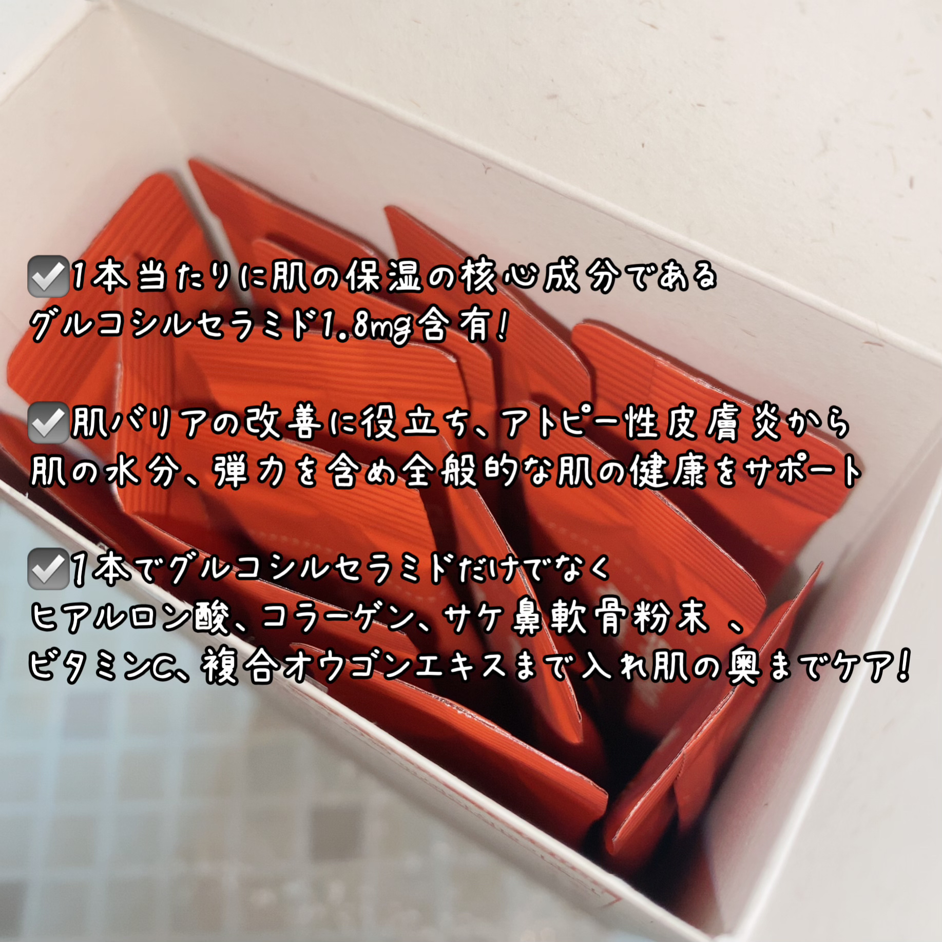 - 飲む植物性セラミド。ゼリーテクスチャーでおいしく摂取するこんにゃく芋エキスグルコシルセラミド。