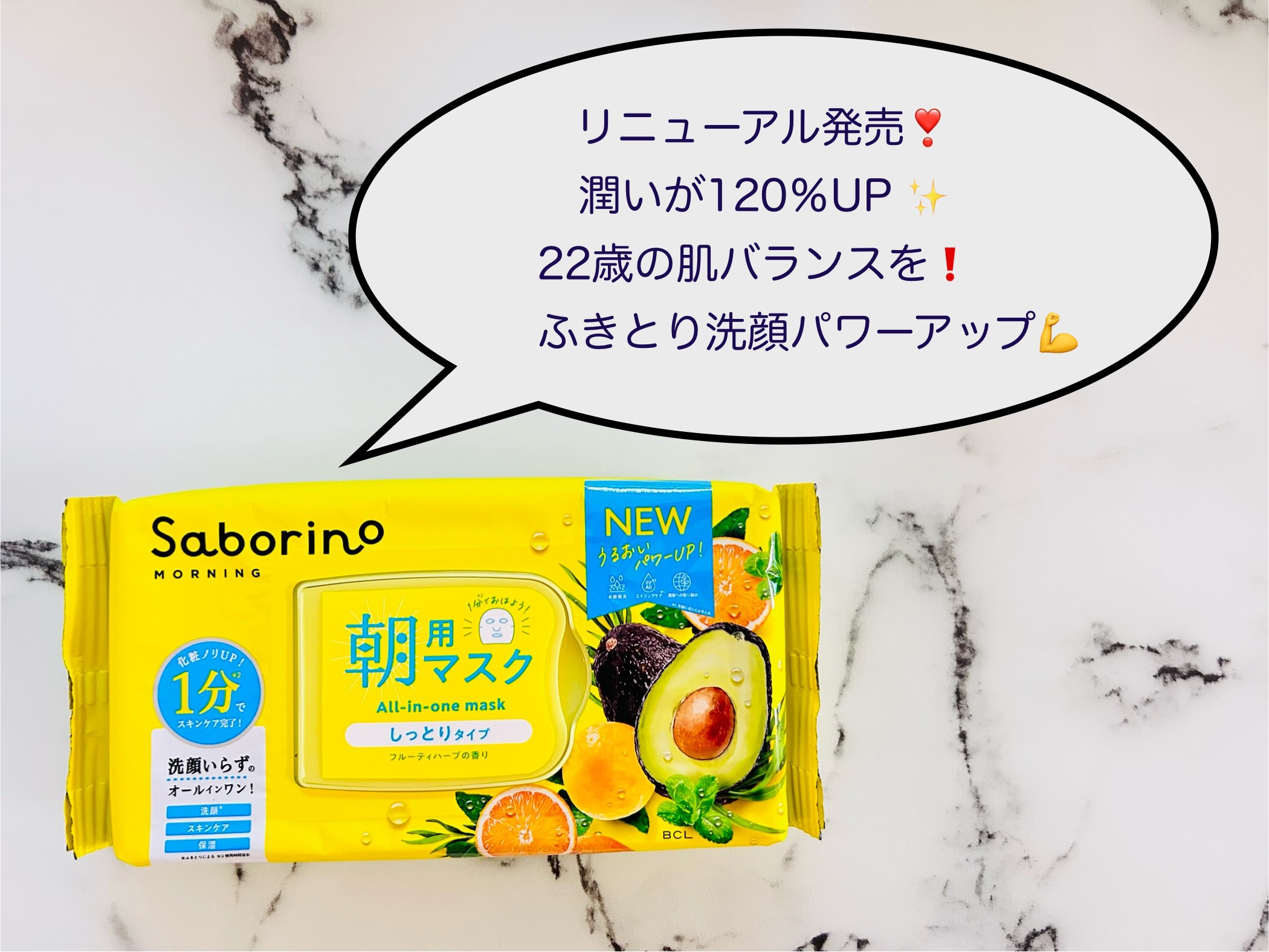 - ※2025年春〜商品パッケージを順次切り替え予定。 サボリーノがパワーUPリニューアル! 1分* 貼るだけでスキンケア完了 ひきしめながらしっかり潤う!洗顔いらずの朝用オールインワンマスク!! 【水密ヴェール処方】潤いが浸透*1 しながら、肌表面はしっとりキープ。 【エイジングケア*2】22歳の肌をイメージした保湿成分。*3 【角質ケア】リンゴ酸+マンデル酸(以上、全て角質ケア)+グリシルグリシン(ひきしめ) 【環境への取り組み】オーガニック*4 やアップサイクル*5 原料、再生可能資源を一部採用。 2種のビタミンC(アスコルビルグルコシド、テトラヘキシルデカン酸アスコルビル:全て整肌)配合 *使用時間目安 *1 角層まで *2 年齢に応じたお手入れ *3 (ホホバ油/マカデミア種子油)エステルズ、スクワレン、マカデミアナッツ脂肪酸フィトステリル、フィトステロールズ、水溶性コラーゲン *4 メリッサ葉エキス、キュウリ果実エキス *5 スクワラン(以上、全て保湿) しっとりタイプ <フルーティハーブの香り> 2023年12月14日 PLAZA/LOFT/公式オンラインショップ 順次先行発売