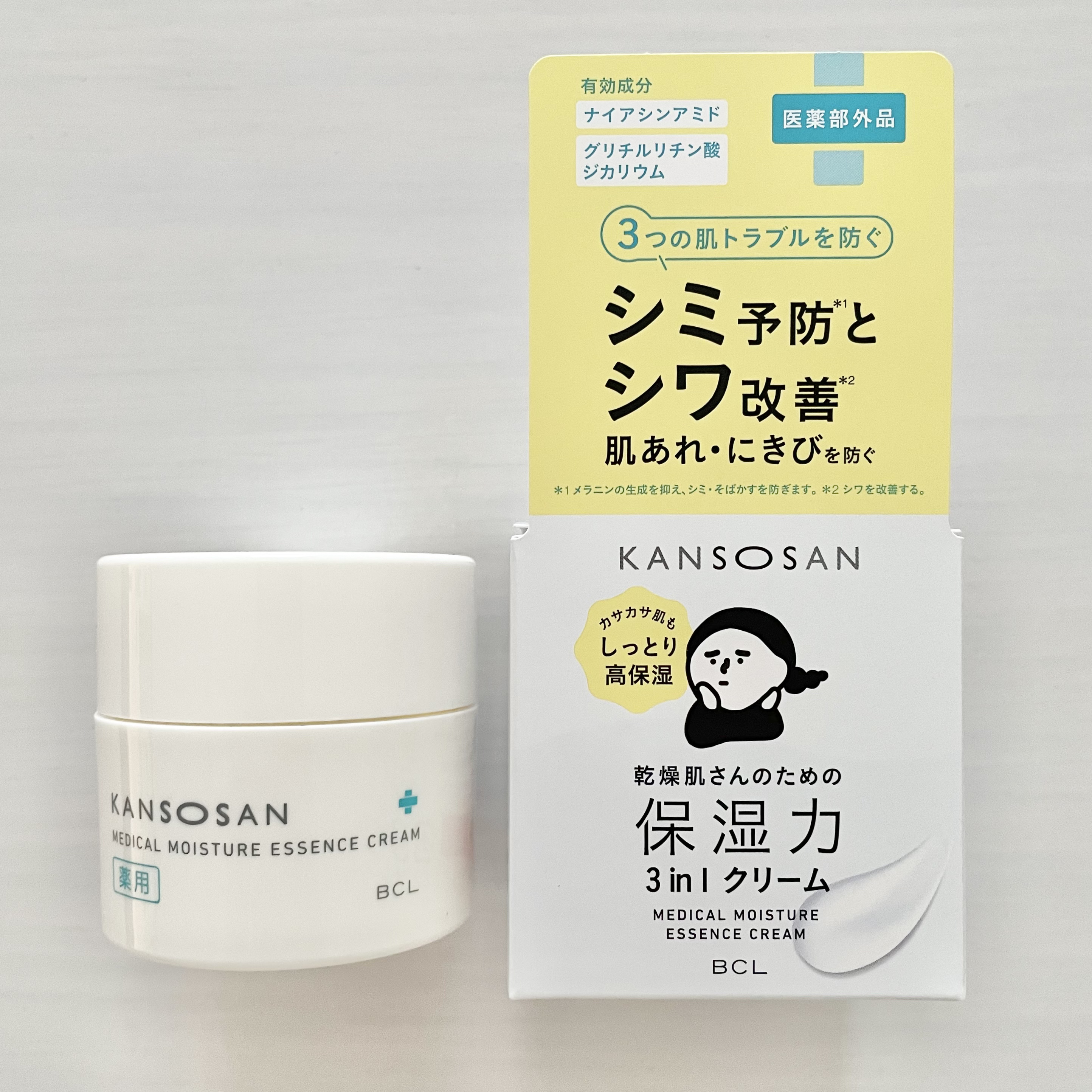 - 【医薬部外品】 乾燥肌さんのための 保湿力3in1クリーム 3つの肌トラブルを防ぐ シミ予防*1とシワ改善*2肌あれ・にきびを防ぐ 【美白*1・シワ改善*2有効成分】 ナイアシンアミド 【肌あれ・にきびを防ぐ有効成分】 グリチルリチン酸ジカリウム *1メラニンの生成を抑え、シミ・そばかすを防ぎます。*2 シワを改善する。 【乾燥ケアのための潤い成分配合】 ヒト型セラミド※1/アミノ酸※2/ワセリン(保湿) ※1 ヒドロキシステアリルフィトスフィンゴシン、N–ステアロイルジヒドロスフィンゴシン、N–ステアロイルフィトスフィンゴシン、ステアロイルオキシヘプタコサノイルフィトスフィンゴシン ※2 DL–アラニン、L–アルギニン、L–セリン、L–プロリン、L–グルタミン酸、L–ロイシン、グリシン(以上、全て保湿) 【1個で3つの効果、しっとりクリーム】 とろんと伸びて、バームのようにピタッと潤い密封。 美容液/乳液/クリーム 【やさしい使い心地とフリー設計】 石油系界面活性剤・パラベン・タール色素・合成香料・アルコール・シリコーンフリー 2023年8月22日 PLAZA/LOFT/EC順次先行発売