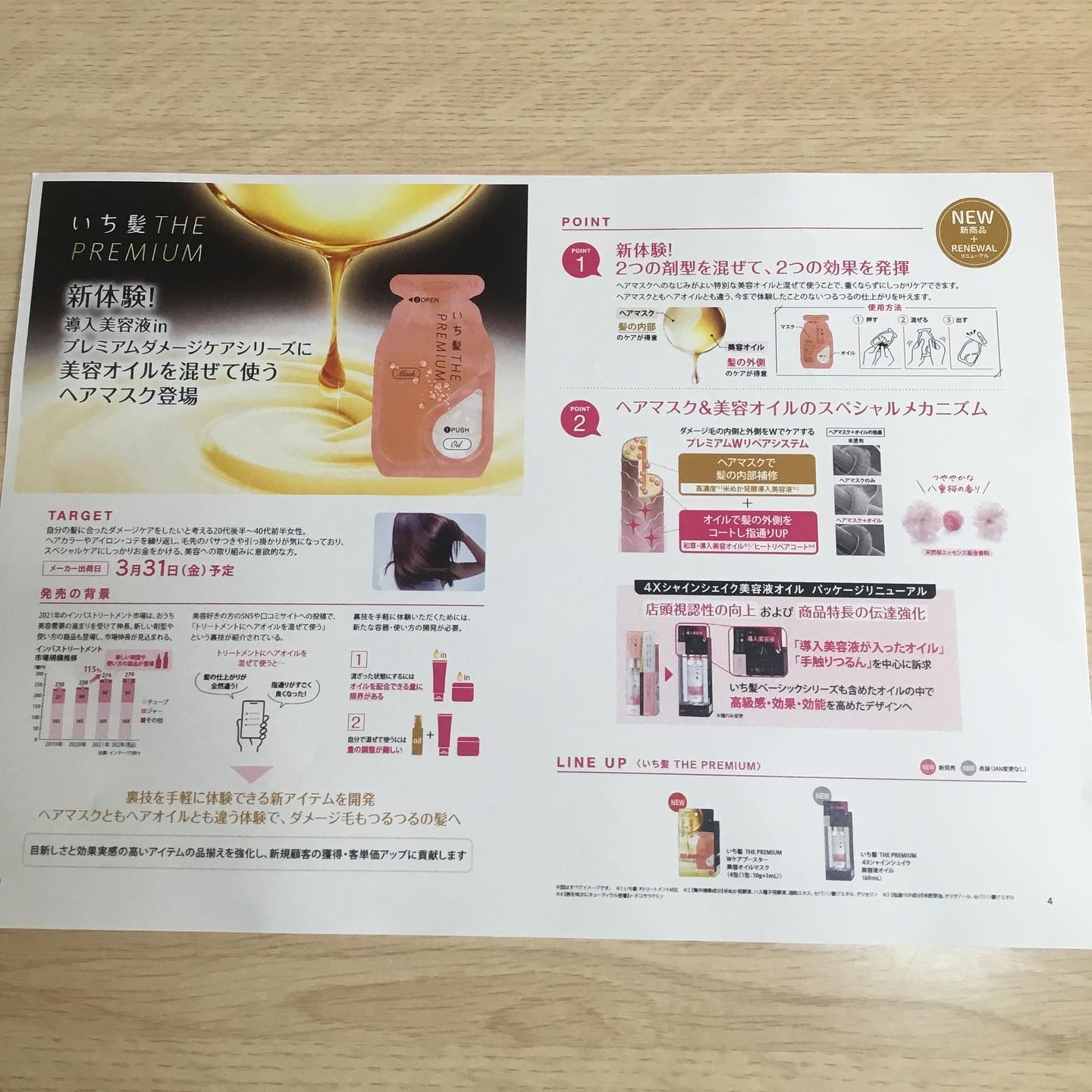 - ●「日本の髪を本質から考える。*1」ヘアケアブランド ●日本の髪研究の成果。アイロン等の熱ダメージによる乾燥髪のためのプレミアムダメージケアシリーズ ●今まで体験したことのない*2美容オイルを注入、混ぜるヘアマスク(洗い流すトリートメント) ●手触り、感動的。集中補修×オイルコートで、ヘアマスクとも、ヘアオイルとも違う体験で、つるんとした髪へ。 ●髪内部と外側をWでケアする「プレミアムWリペアシステム」 ・集中補修成分「高濃度*3米ぬか発酵導入美容液*4」配合のヘアマスクで、髪の内部を補修 ・指通りUP成分「和草・導入美容オイル*5」とドライヤーの熱を味方にキューティクルを密着する「ヒートリペアコート成分*6」で、髪の外側をコートして指通りをアップ ●つややかな八重桜の香り(天然桜エッセンス配合香料) ●サルフェートフリー(硫酸系界面活性剤不使用) ●合成着色料フリー *1:日本の風土や気候などの環境に合わせたヘアケア方法を研究しています。 *2:いち髪ブランド内 *3:いち髪 THE PREMIUM エクストラダメージケアトリートメント(シャイニーモイスト)比 *4:米ぬか発酵液、ハス種子発酵液、酒粕エキス、セバシン酸ジエチル、グリセリン *5:米胚芽油、オリザノール、セバシン酸ジエチル *6: γ-ドコサラクトン