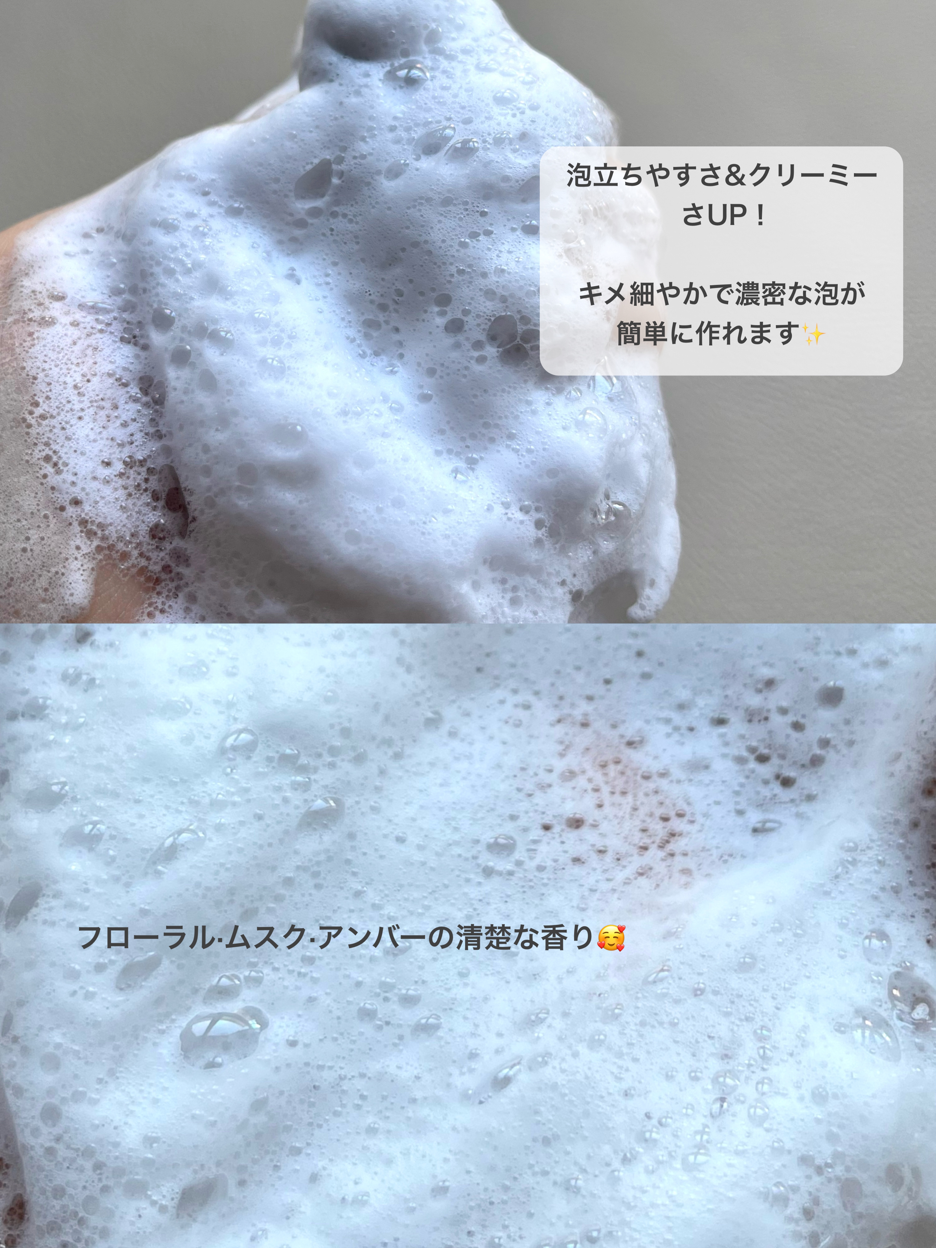 | 泡がしっとりなめらか濃密!! なのに泡切れも良くさらっと流れせてぬるつきも残らないのがうれしいポイントです♬ | 詳細を見る | ||