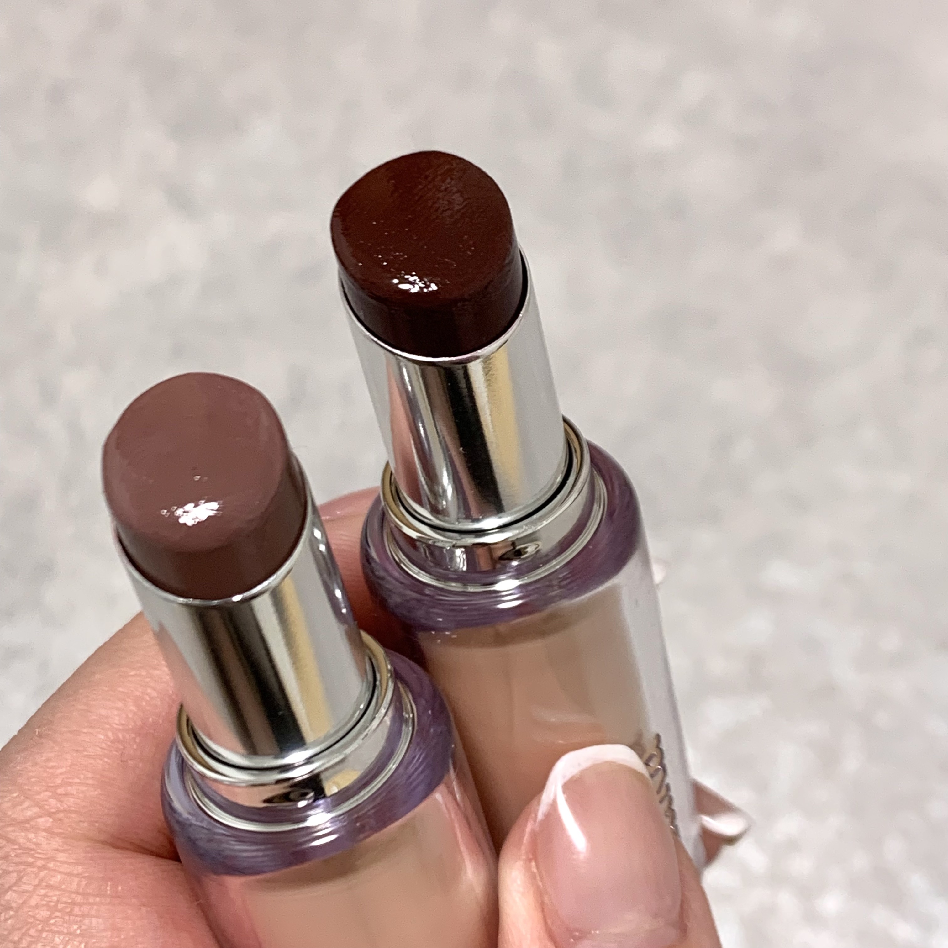 今回の新色がブルベ激アツな件🔥💓売り場が可愛過ぎて買う予定全くなかったのに吸い込まれてった(笑)テスターしたらマジで可愛くて即決だった。とりあえず2色厳選して大満足❤️やっぱこのとろ〜り感好きだわ〜!🤭唇の皮剥けとか乾燥すごいタイプなんだけ...