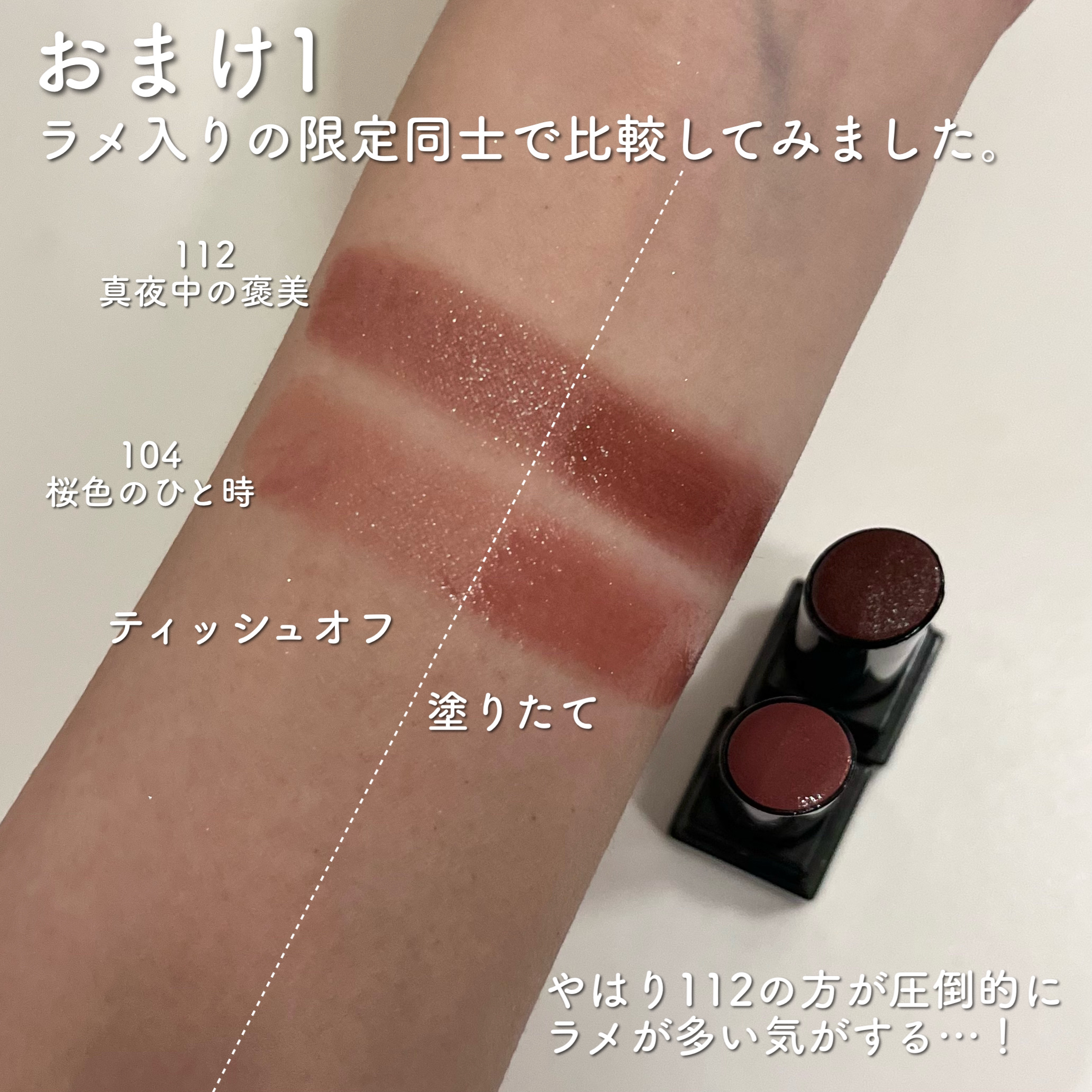 ラスボスは紅折り紙よりも明るく、くすみ弱めの青みレッド。 誓いのルビーは逆に紅折り紙よりもかなり暗くボルドー寄り。 チェリーの自惚れは色味がいちばん紅折り紙と近いかも。しかし質感が全く違うので印象がかなり変わります🥺 リップモンスターはツヤツヤ透け感のある仕上がりの一方、ネンマクフェイクルージュはツヤ感が弱いもののしっとりしっかり染め上げてくれるイメージ。 どちらかというとマット寄りのチェリーの自惚れの方が落ち着いて見えるかもしれません。 ティッシュオフしてみると、青み深みが残る誓いのルビーがいちばん似た色になるという結果に!誓いのルビーの方がかなり深くはあります。 ラスボスはやや明るくニュートラルに、チェリーの自惚れは赤というよりはピンク系になりました。