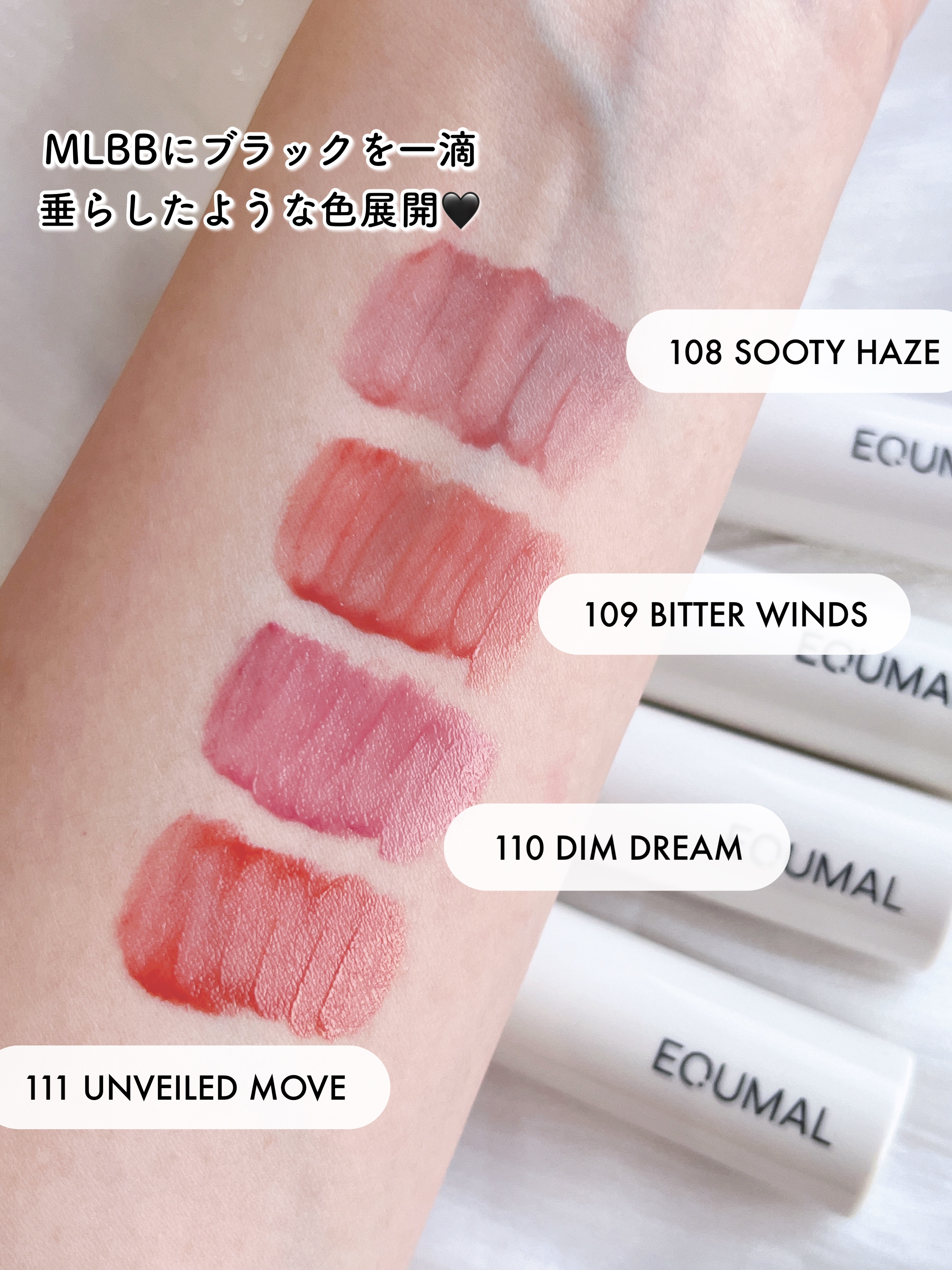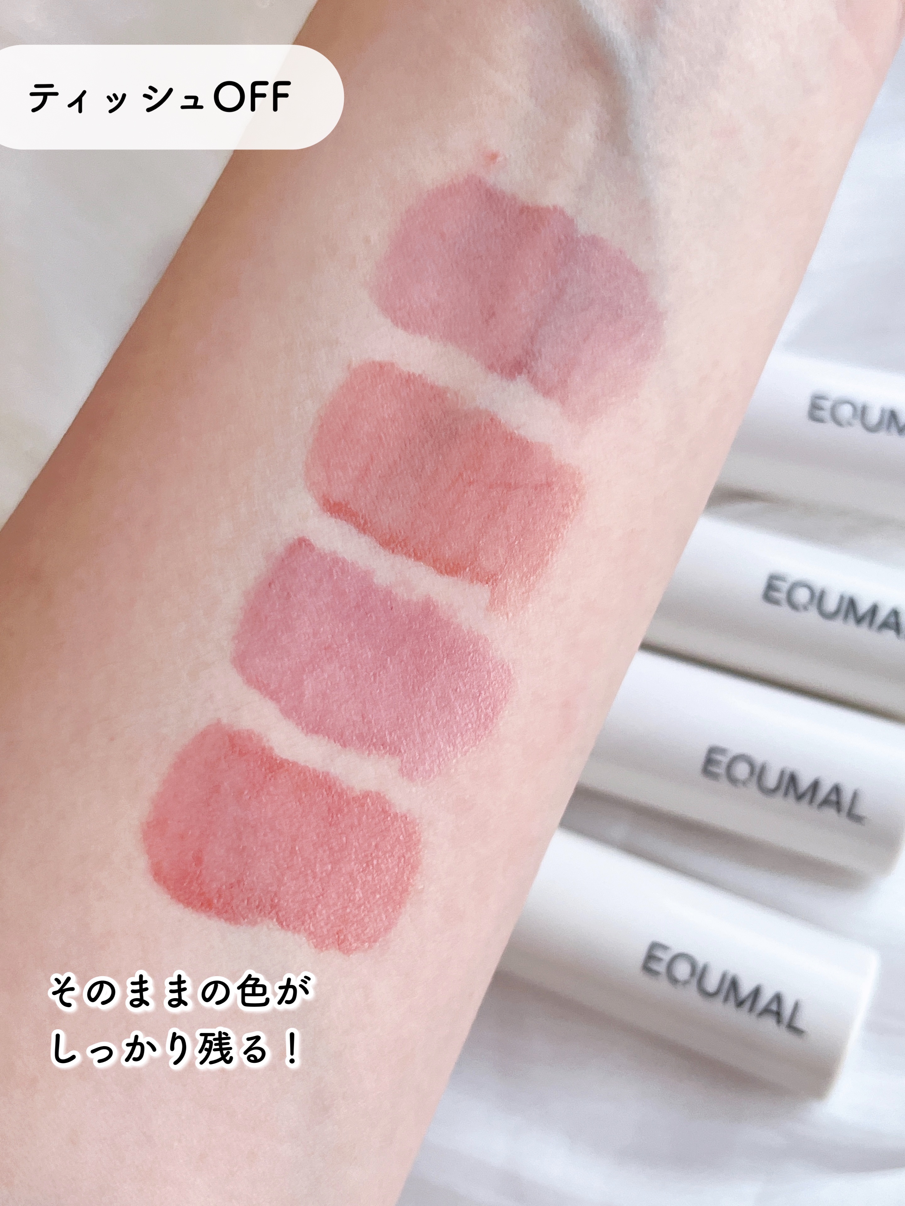 117 ROSY CHILLは、ノンセクショングローリーティントのMLBBライン。 青みのあるローズピンクで、肌に馴染む絶妙な明るめカラーなので、その名の通り「まるで自分の素の唇が綺麗に見えるような」MLBBカラー。 明るい色だけど白っぽさとかもなくて、溶け込むように馴染む感じ。 EQUMALティントの好きなところは、絶妙なツヤ感。 塗って数分経つとクリアなツヤがじんわり出てきて オイルを薄くまとったような仕上がりに。 これからリピ確定の大成功リップです👏
