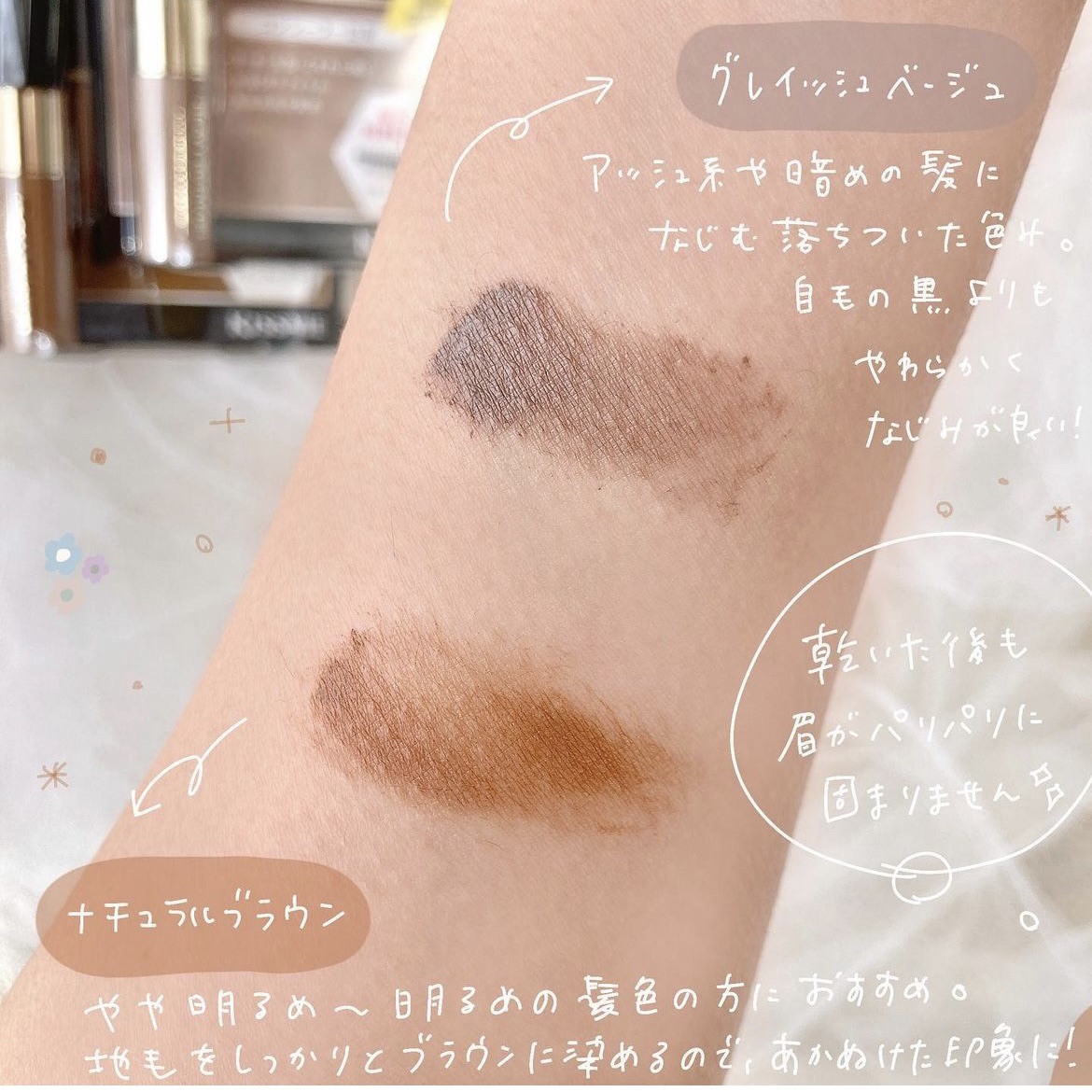 - 瞬時に『ナチュ眉』 ヘアに合わせて明るくチェンジ! ■ひと塗りでしっかり発色 眉毛の黒色をしっかりカバーし、きれいに発色します。 一度塗りでもしっかりと色が付き、重ねて塗るとさらに発色が良くなります。 ■地肌に付きにくく、簡単に塗ることができる、テクニカルブラシ採用 地肌につきにくいコンパクトサイズのテクニカルブラシを採用しています。 ムラになりにくく、誰でも簡単に塗ることができます。 ■どんな髪色にも対応できるカラーバリエーション 眉色を髪色に合わせたり、色味をおさえて明るくするだけで、自然でふんわりとした雰囲気に仕上がります。さらに、アイメイクを引き立て目を大きく見せます。 ■長時間落ちにくいのに、お湯で簡単オフ 汗・水・皮脂・こすれに強く、長時間落ちにくい処方です。 フィルムタイプなので、ぬるま湯でスルッと簡単に落とせます。 ■パンテノール(眉毛保護成分)配合 水溶性のビタミンで、肌に潤いと弾力を与えます。眉毛にツヤ・ハリを与えます。
