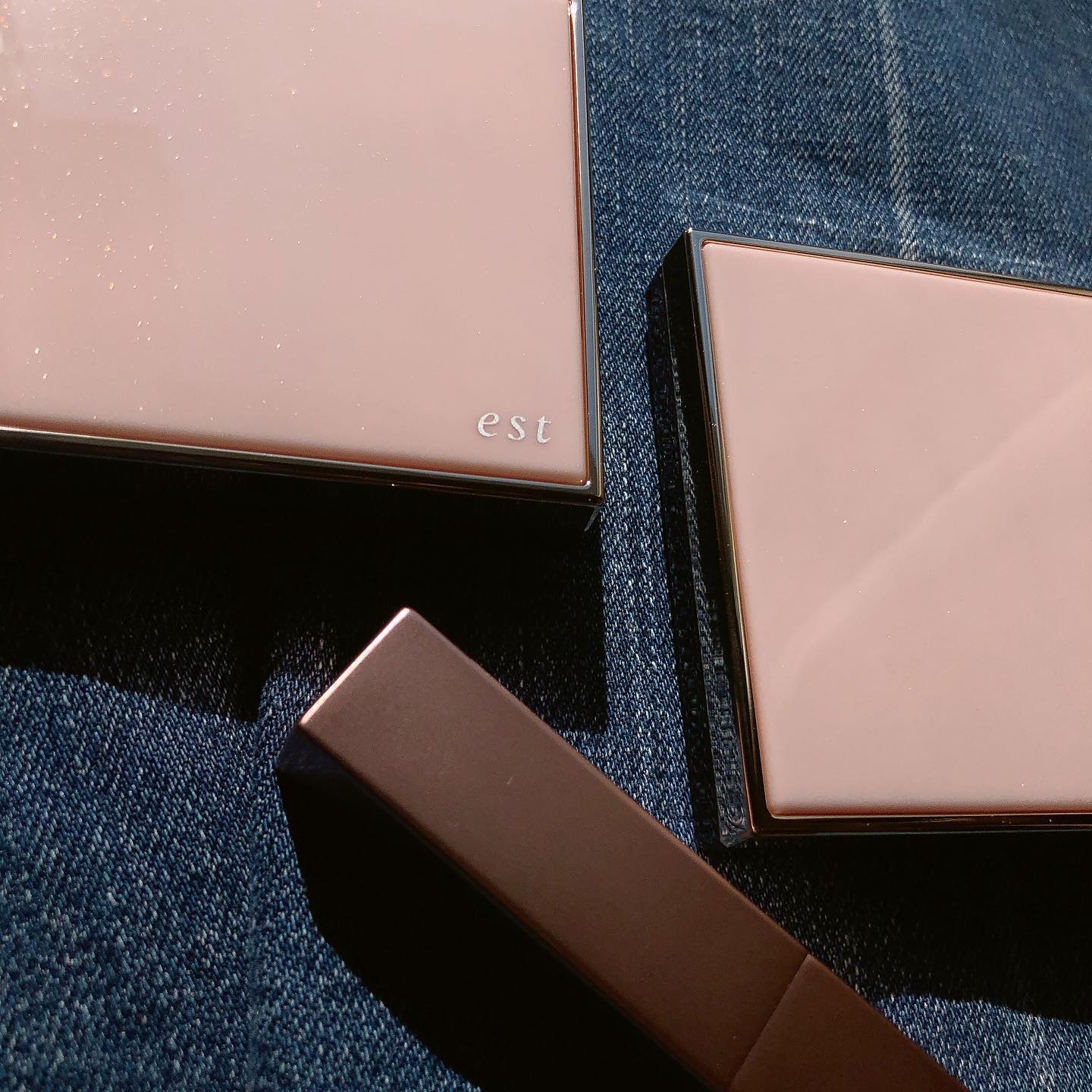 目元は奥行きのある透明感 口元は温もりのある血色感がポイント 外箱は温かみをイメージしているらしい🪴 透けダークカラーが入っていて透けている濃い色をつけることで自然に陰影を作ることができるよ! チークはふんわり発色で混ぜて使ったり単体で使ったりもできて、ハイライトのようにくすみを消したりもできるよ😇 リップも発色が良く、元の唇のくすみをカバーしてくれて色持ちも良くて使いやすかった。 estってスキンケアのイメージが強かったけどメイク品もかなり可愛くて良かった💜