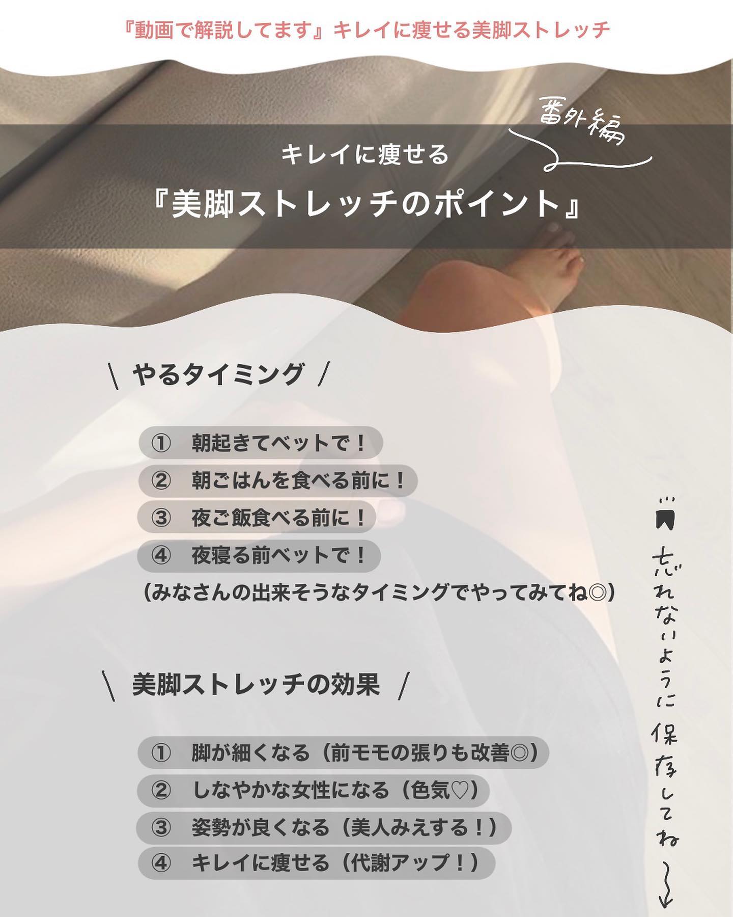 ストレッチが続かない人の特長&ストレッチを長続きさせるコツをご紹介✨ストレッチ=頑張るものと思わないこと。柔軟性は「痛みに耐える」よりも、毎日ちょっと動かすことで変わります。10秒でも1分でもOK。気持ちいい範囲で続けよう。できない日があって...