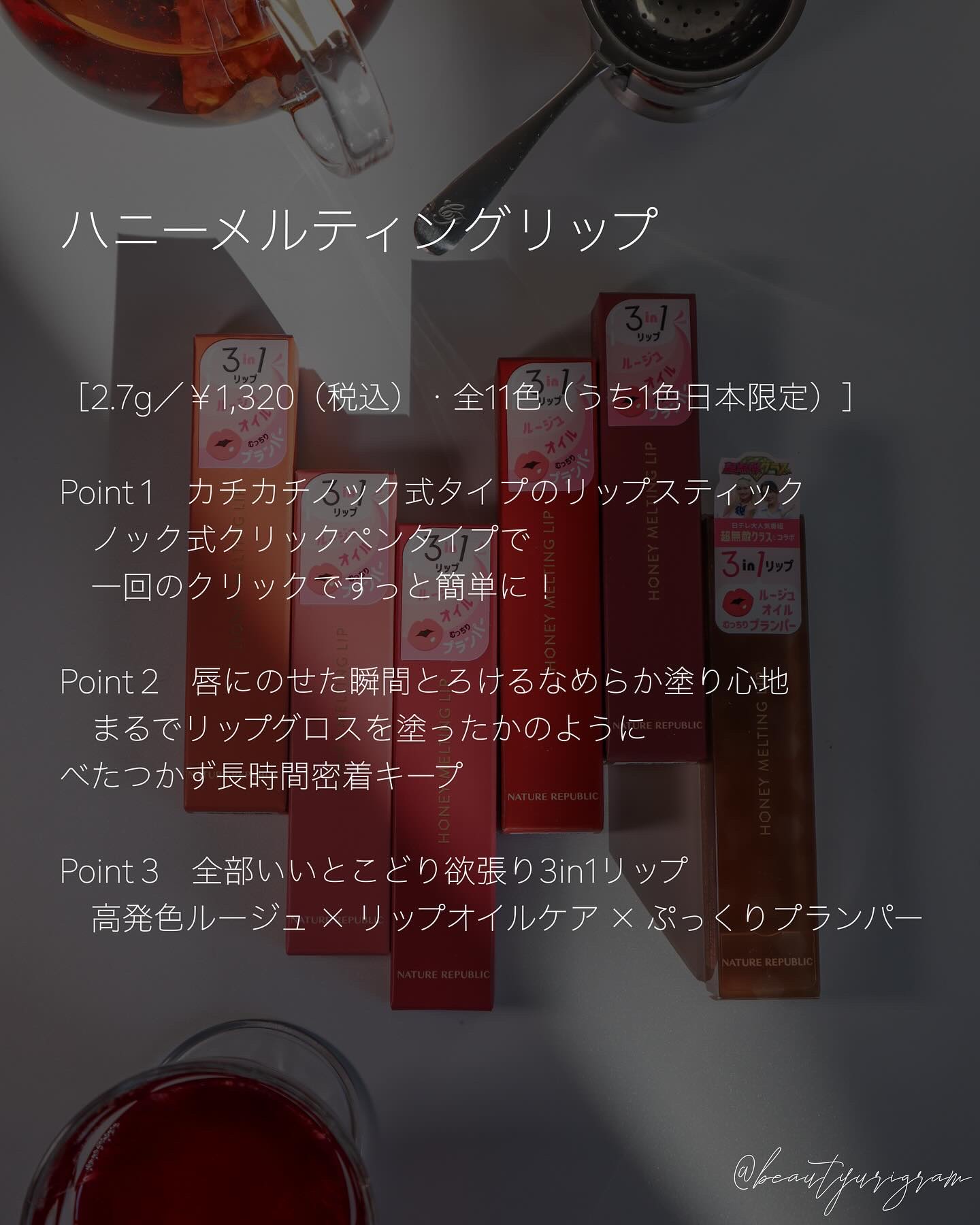 - 韓国では実店舗、オンラインともに完売が続出し、なかなか手に入らないと話題になっている「ハニーメルティングリップ」。 ルージュのように発色し、リッププランパーをつけたかのようなボリューム感を出すことができるリップです。 ハチミツエキス、バラエキス(*)、8種の天然由来オイル(*1)が配合されており、リップオイル効果で韓国アイドル風のあどけない唇を演出できます。 高発色なのにとろける“むっちり唇” 3in1〚ルージュ/高発色〛〚むっちりプランパー/立体感〛〚リップオイル/高保湿〛いいトコ取りの欲張りリップで韓国アイドル風のあどけないぷるぷるリップに演出! *センチフォリアバラ花エキス *1.アーモンド油、アルガニアスピノサ核油、アンズ核油、オリーブ果実油、シア脂、ツバキ種子油、ホホバ種子油、月見草油 (*ー*1.全て保湿成分) 2023年11⽉13⽇(月):ネイチャーリパブリック公式サイト 12月8日(金):全国のバラエティショップ、マツモトキヨシグループ、ココカラファイングループ、ドン・キホーテにて順次発売