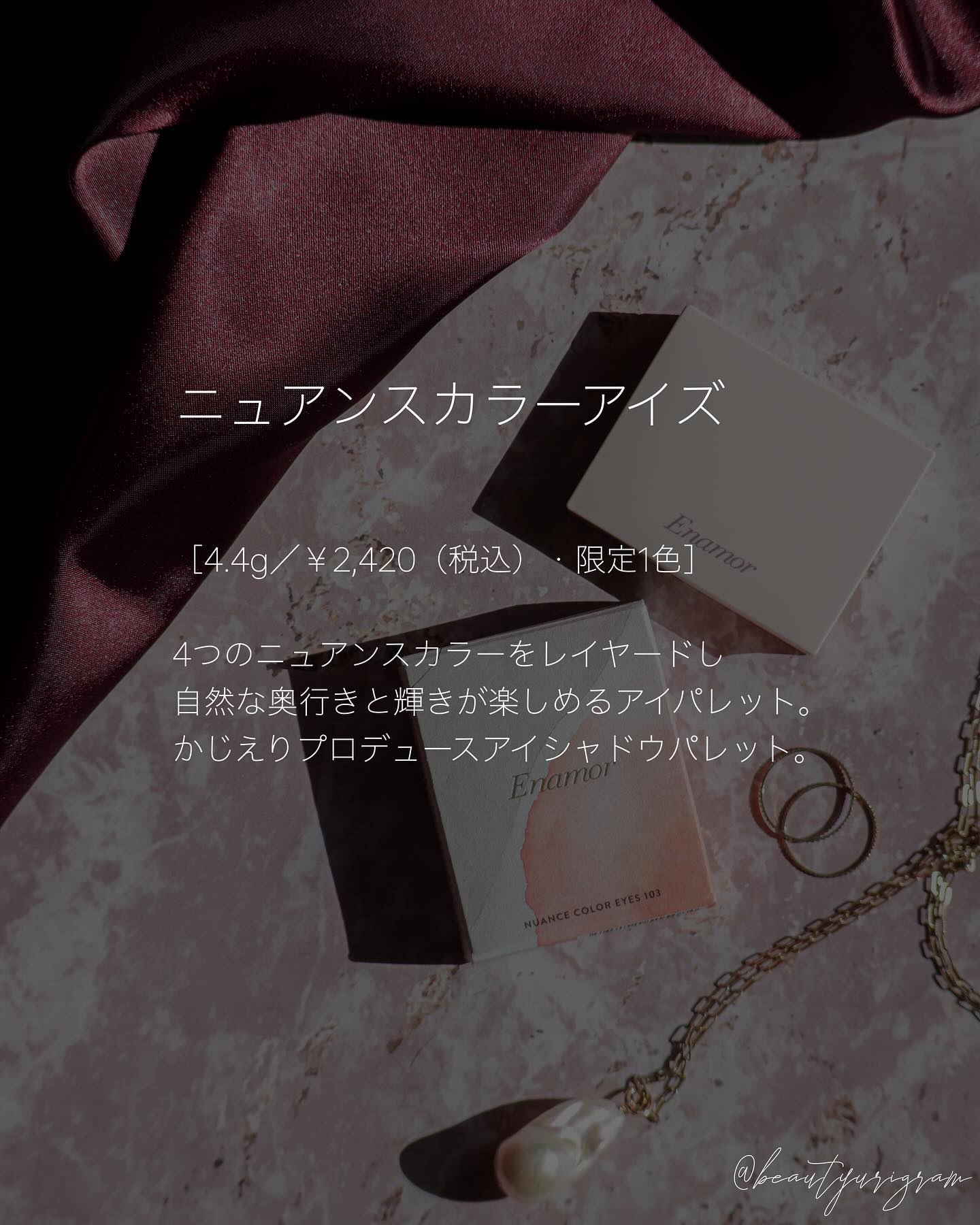 - 4つのニュアンスカラーをレイヤードし 自然な奥行きと輝きが楽しめるアイパレット。 Enamorニュアンスカラーアイズは 「攻めすぎず、媚びすぎない自分らしさ」をコンセプトに、 肌に馴染みやすくしっとりしているけれども さらっと軽くボカしやすいテクスチャーと カラー展開にこだわりました。 ニュアンスカラーをレイヤードすることで 自然な奥行きが演出でき、作り込みすぎない 自分らしいナチュラルな仕上がりにしてくれます。