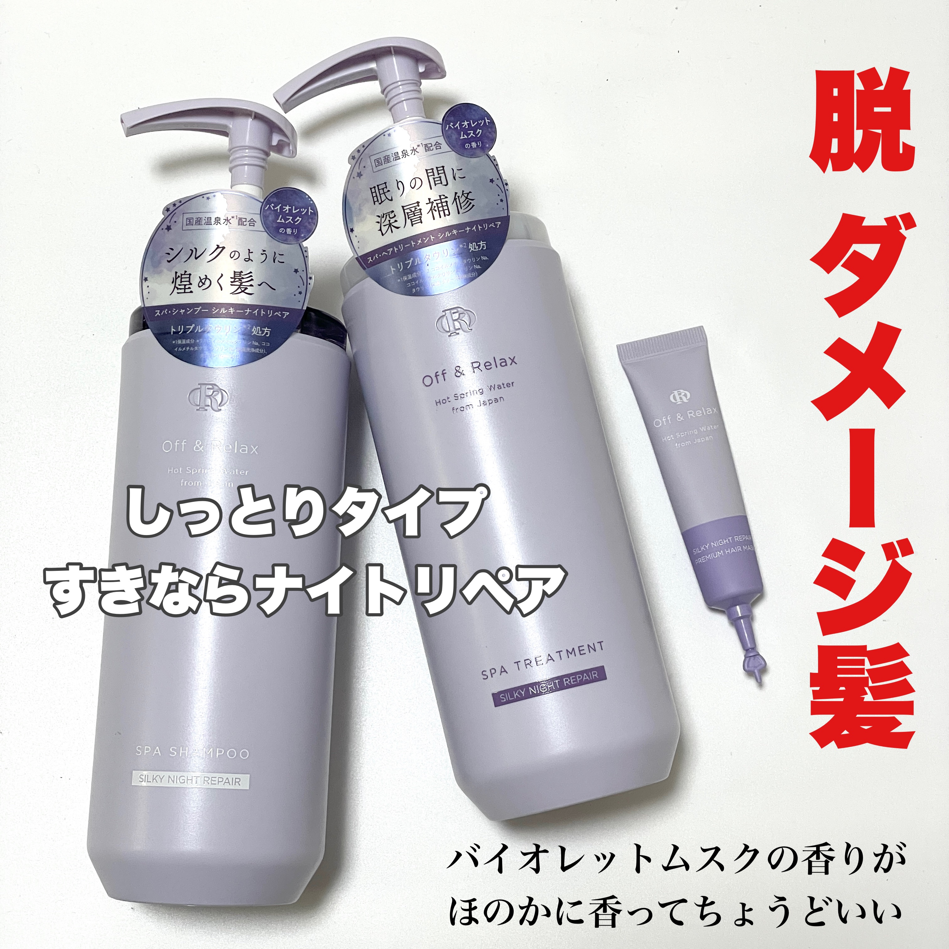 憧れの寝癖がつきにくい髪へ✨⌒*⌒*⌒*⌒*⌒*⌒*⌒*⌒*⌒*⌒*⌒*⌒✔️Off&RelaxORスパ・シャンプーシルキーナイトリペア460mL✔️Off&RelaxORスパ・ヘアトリートメントシルキーナイトリペア460mL⌒*⌒*⌒*⌒*...