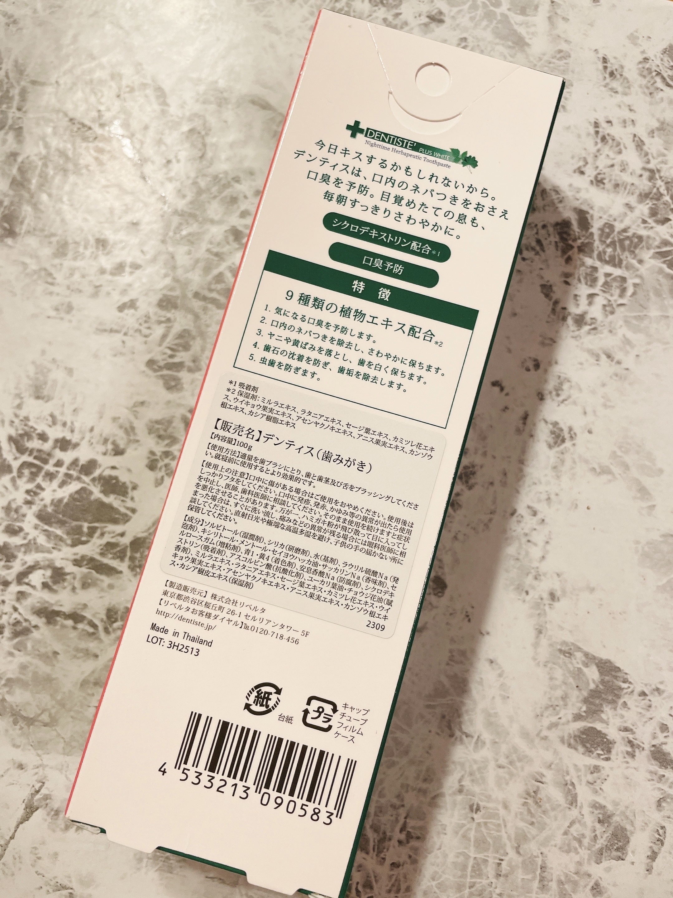 - 目覚めてすぐKissできる 恋する♡ハミガキ 「デンティス」は、口臭予防のできる歯磨き粉です。長時間息スッキリ! ■口臭の元を洗い流し、爽やかな息*1へ ニオイの原因となる成分を吸着除去するとされる「シクロデキストリン」*2配合。 オリジナルミントフレーバー*3がイヤなニオイや苦み成分をマスキングして爽やかな息に導きます。 また、口臭の元である汚れを洗い流し、ブラッシング後の口臭を防ぎます。 ■植物エキス*4で口内を潤す 数種類の植物エキス*4により、口内を潤し口臭予防をサポートします。 *1:マスキング効果 *2:吸着剤 *3:香料 *4:ミルラエキス、ラタニアエキス、セージ葉エキス、カミツレ花エキス、ウイキョウ果実エキス、アセンヤクノキエキス、アニス果実エキス、カンゾウ根エキス、カシア樹脂エキス(保湿剤)