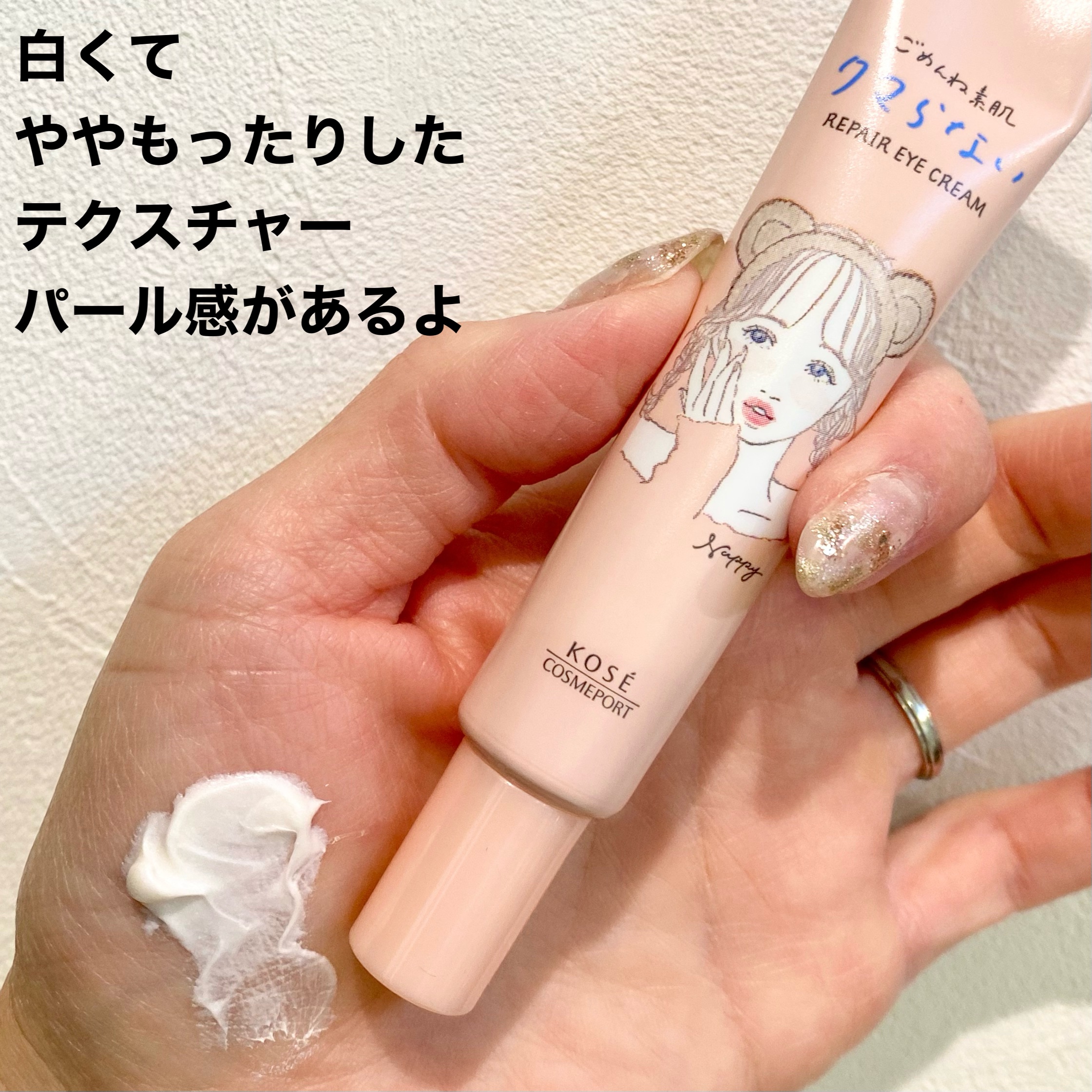 - 好調なごめんね素肌シリーズから、 若年層の目もと悩みを徹底ケアするアイクリームを新発売! ❶あらゆる目もと悩みを集中ケア!〈 乾燥ダメージ+くすみ※+涙袋うるおいケア 〉 濃厚なクリームで、乾燥やくすみ※の気にならない、ぷっくりうるおった目もとへみちびきます。 【乾燥ダメージケア】レチノール誘導体(保湿) 【くすみ※ケア】ナイアシンアミド・ビタミンC誘導体(保湿) 【涙袋うるおいケア】浸透型ヒアルロン酸・白キクラゲ多糖体・セラミド(保湿) ❷うるおいをあたえながら、クマ・くすみもカバー !※2すっぴんからキレイな目もとへ トーンアップパール配合!クマやくすみをナチュラルにカバーします。※2 ❸皮膚が薄く、デリケートな目もとにもやさしい使い心地 【低刺激処方】弱酸性 無香料 無鉱物油 アルコールフリー パラベンフリー(防腐剤) 紫外線吸収剤フリー シリコーンフリー 【各種試験済み】パッチテスト アレルギーテスト スティンギングテスト 敏感肌自覚者による連用テスト 乾燥小じわの効能評価試験済み (全ての方に、刺激やアレルギーなどが起きないというわけではありません) ※乾燥による ※2パールによるトーンアップ(メイク)効果のこと