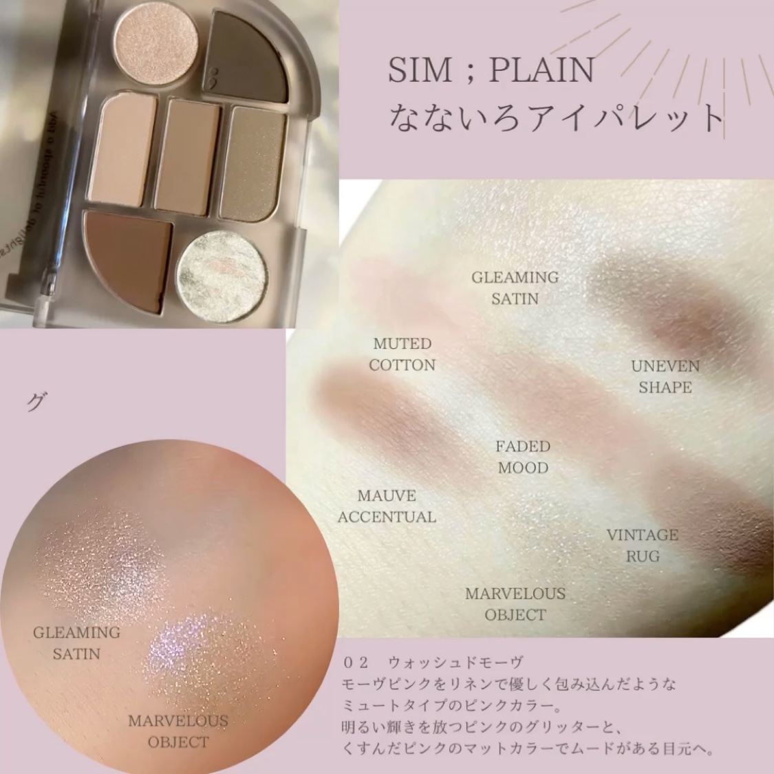 - ”感性”が日常に溶け込んだビューティーブランド”Sim;plain(シンプレイン)”。 いつもの自分にいまどきのムードを加えた、デイリーメイクアップをお届けします。 なないろのパレットは重ねるごとに透明感が増すようなレイヤリングパレットです。 柔らかく溶け込むテンダースムーズ工法のマッドシャドウとハンドメイド工法の大理石グリッターを含め、 3~4種の様々なテクスチャーで構成された7色パレットです。 <01 オフベージュ> オフベージュはゆったりとした余裕と安らぎが感じられるコーラルベージュカラー。 <02 ウォッシュドモーヴ> ウォッシュドモーヴはモーヴピンクをリネンで優しく包み込んだようなミュートタイプのピンクカラー。 <03 ニッティングコーラル> ニッティングコーラルはヴィンテージを詰め込んだソフトなコーラルカラー。 <04 パーリーグロウ> パーリーグロウは真珠のような輝きがきらめく、ニュートラルピンク。