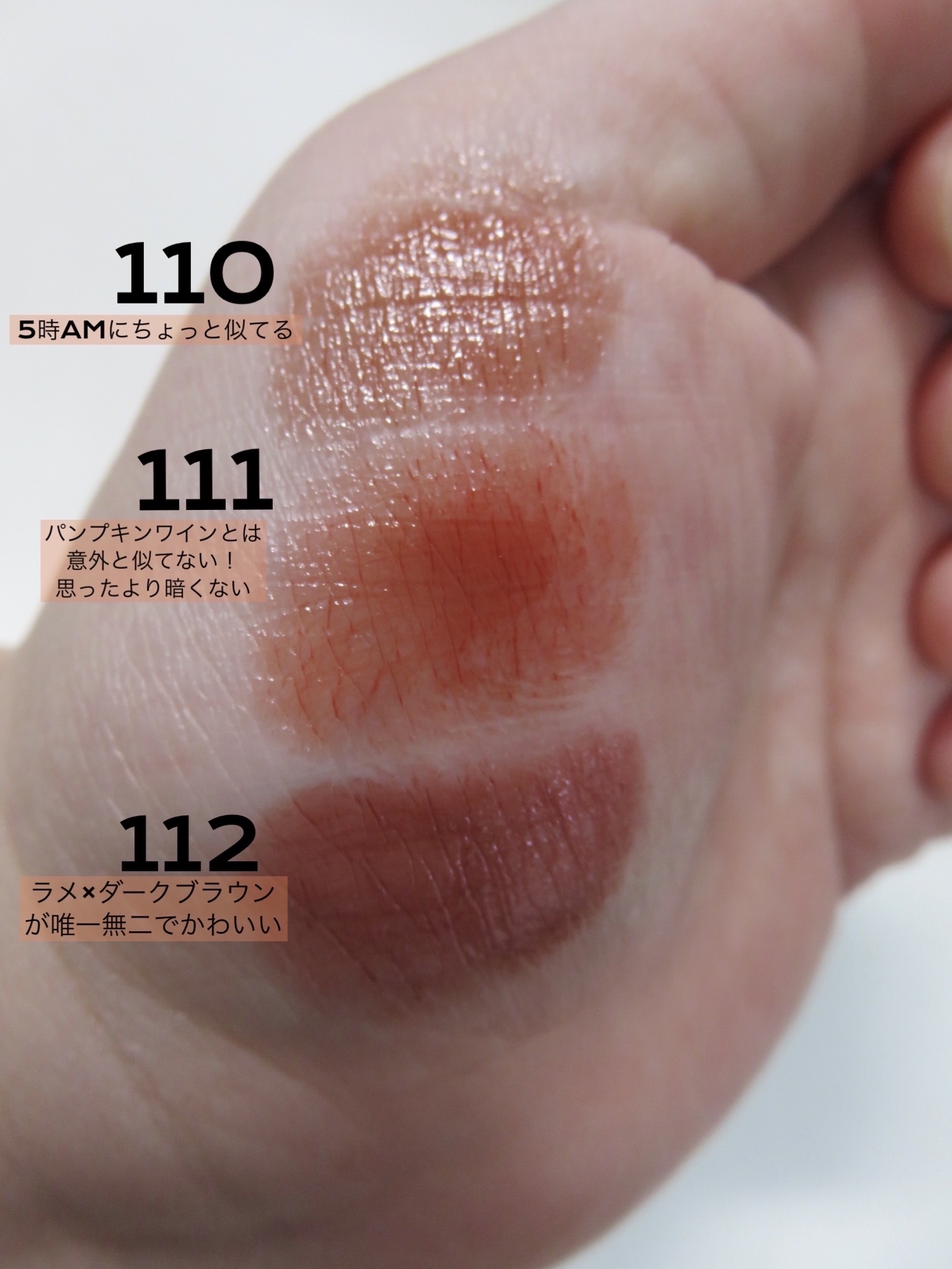 特に11月生まれだから111は買うつもりだったんだけど、112のラメ×ブラウンが可愛すぎて絶対欲しいと思ってた💓 期待を上回ったのは111番♡オレンジレッドだからパンプキンワインみたいなガッツリオレンジブラウンに近いと思いきや、赤とオレンジのバランスがちょうど良くて、まろやかさもあるし、温かみもあるし、中間色っぽい明るさで絶妙なかわいさ💓 110番はナチュラルメイクにも使いやすそう✨ピンク系の唇なので薄く塗ればピンクブラウンっぽくなるところが、5時AMに似てた💕 112は濃いめだからガッツリ塗ると人を選ぶけど透け感があるからサラッと塗れば結局みんないける!! 今年最後のMYリップモンスター、最高でした!