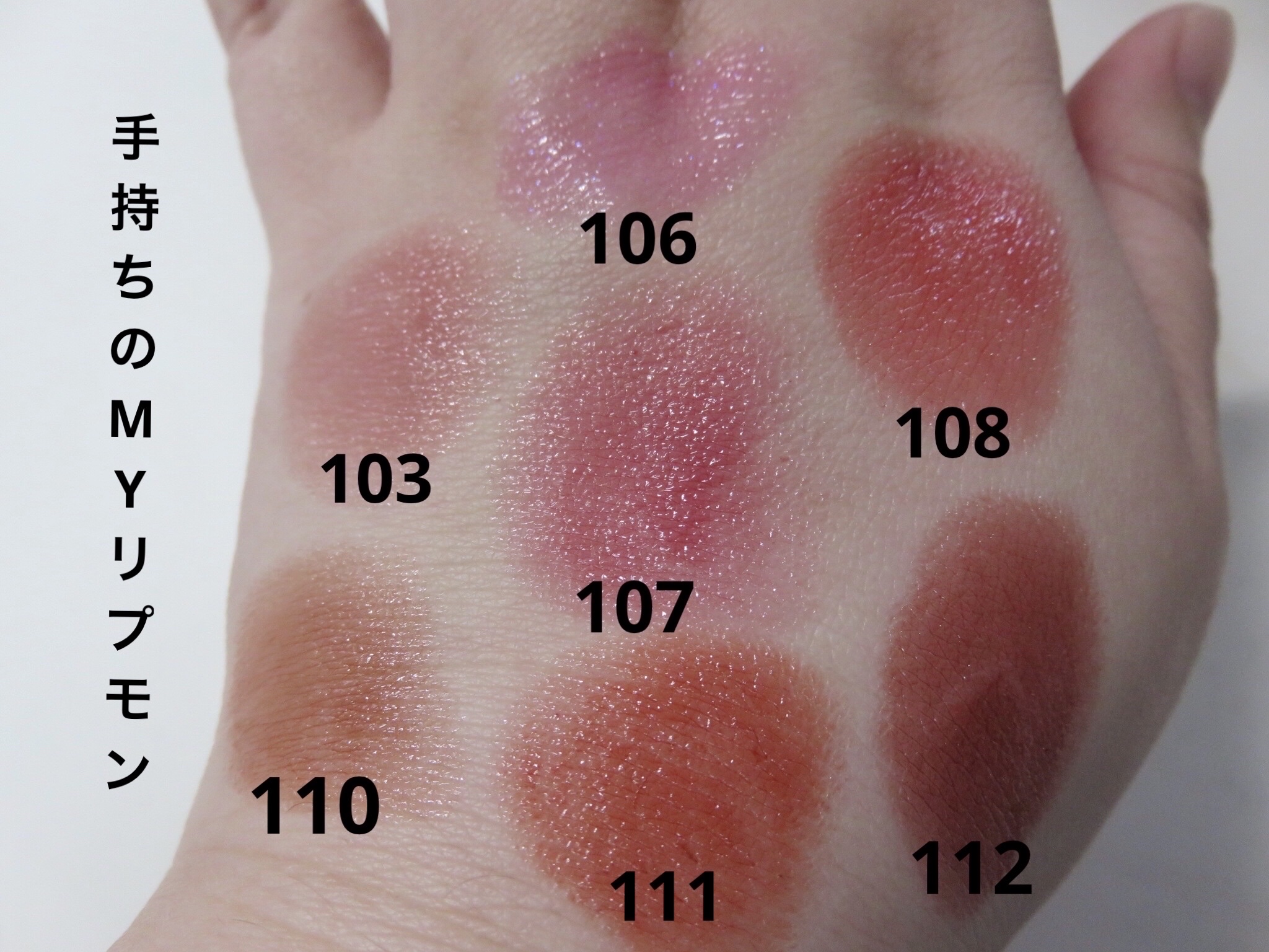 KATE リップモンスター 102 甘い主役 103 秘めた炎 104 桜色のひと時 106 夜雲の涙 107 紅折り紙の願い 110 闇夜のファンファーレ 112 真夜中の褒美 手持ちの7色を並べてみました #KATE #リップモンスター #マイリップモンスター