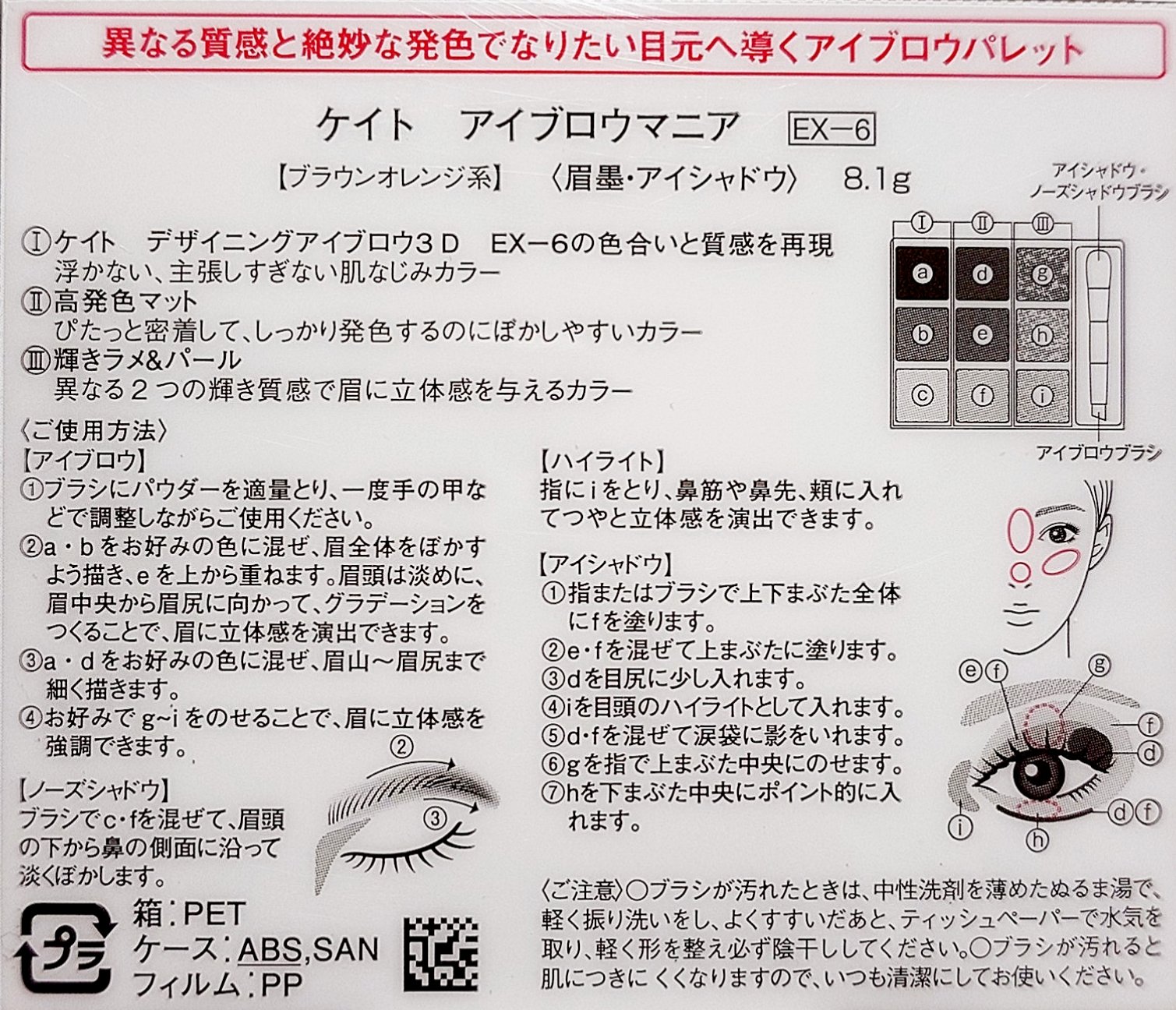 - 数量限定発売 眉・目もと・涙袋・鼻筋などにマルチ使いできる。 1パレットで自由自在になりたい目もと印象へ。 1 デザイニングアイブロウ3Dの色合いと質感を再現 誰でも簡単に描けるよう設計された、浮かない・主張しすぎない肌なじみの良いカラー 2 高発色マット 肌にぴたっと密着して、しっかり発色するのにぼかしやすいカラー 3 輝きラメ&パール 異なる2つの輝き質感で眉に立体感を与えるカラー