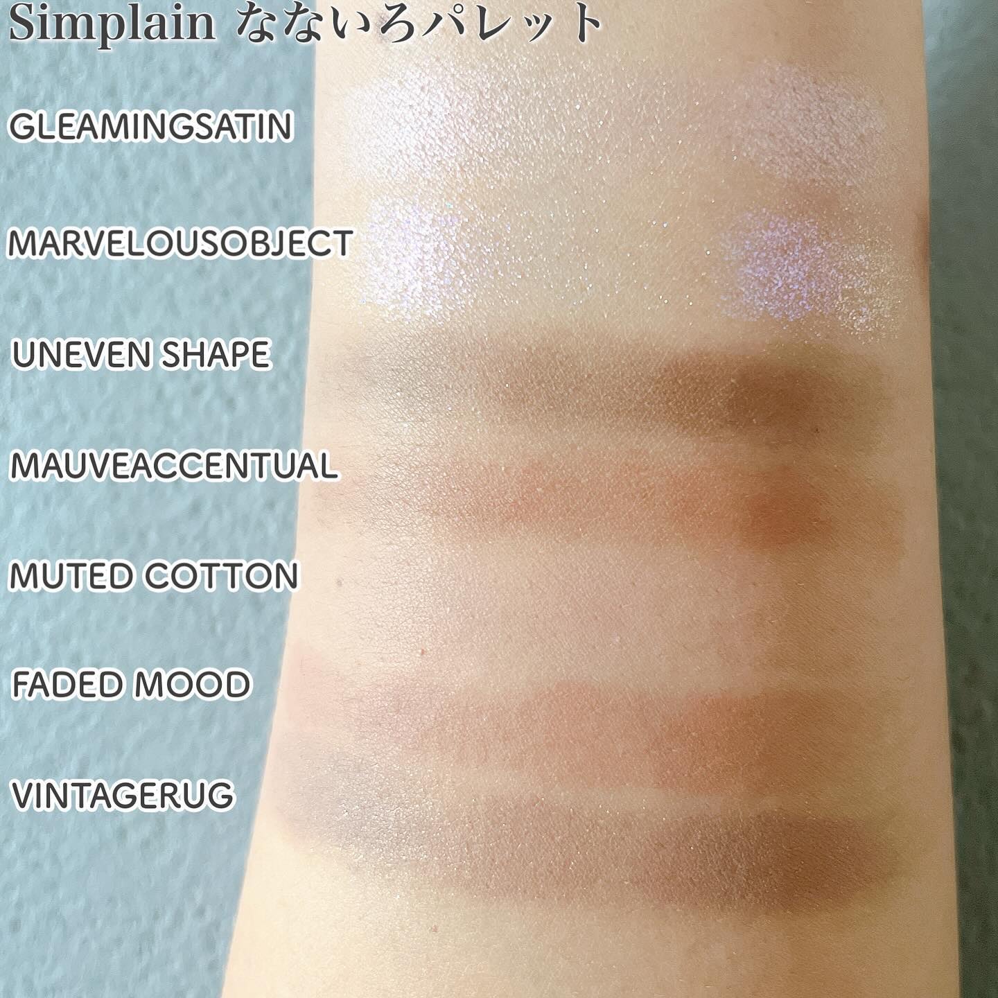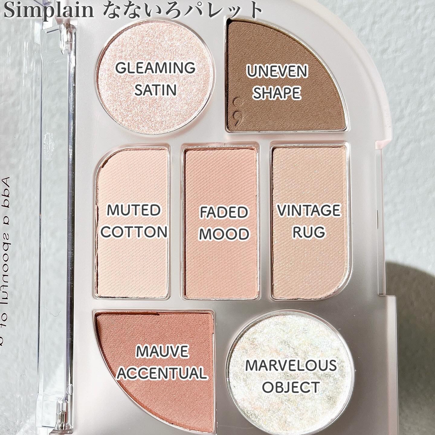 - ”感性”が日常に溶け込んだビューティーブランド”Sim;plain(シンプレイン)”。 いつもの自分にいまどきのムードを加えた、デイリーメイクアップをお届けします。 なないろのパレットは重ねるごとに透明感が増すようなレイヤリングパレットです。 柔らかく溶け込むテンダースムーズ工法のマッドシャドウとハンドメイド工法の大理石グリッターを含め、 3~4種の様々なテクスチャーで構成された7色パレットです。 <01 オフベージュ> オフベージュはゆったりとした余裕と安らぎが感じられるコーラルベージュカラー。 <02 ウォッシュドモーヴ> ウォッシュドモーヴはモーヴピンクをリネンで優しく包み込んだようなミュートタイプのピンクカラー。 <03 ニッティングコーラル> ニッティングコーラルはヴィンテージを詰め込んだソフトなコーラルカラー。 <04 パーリーグロウ> パーリーグロウは真珠のような輝きがきらめく、ニュートラルピンク。