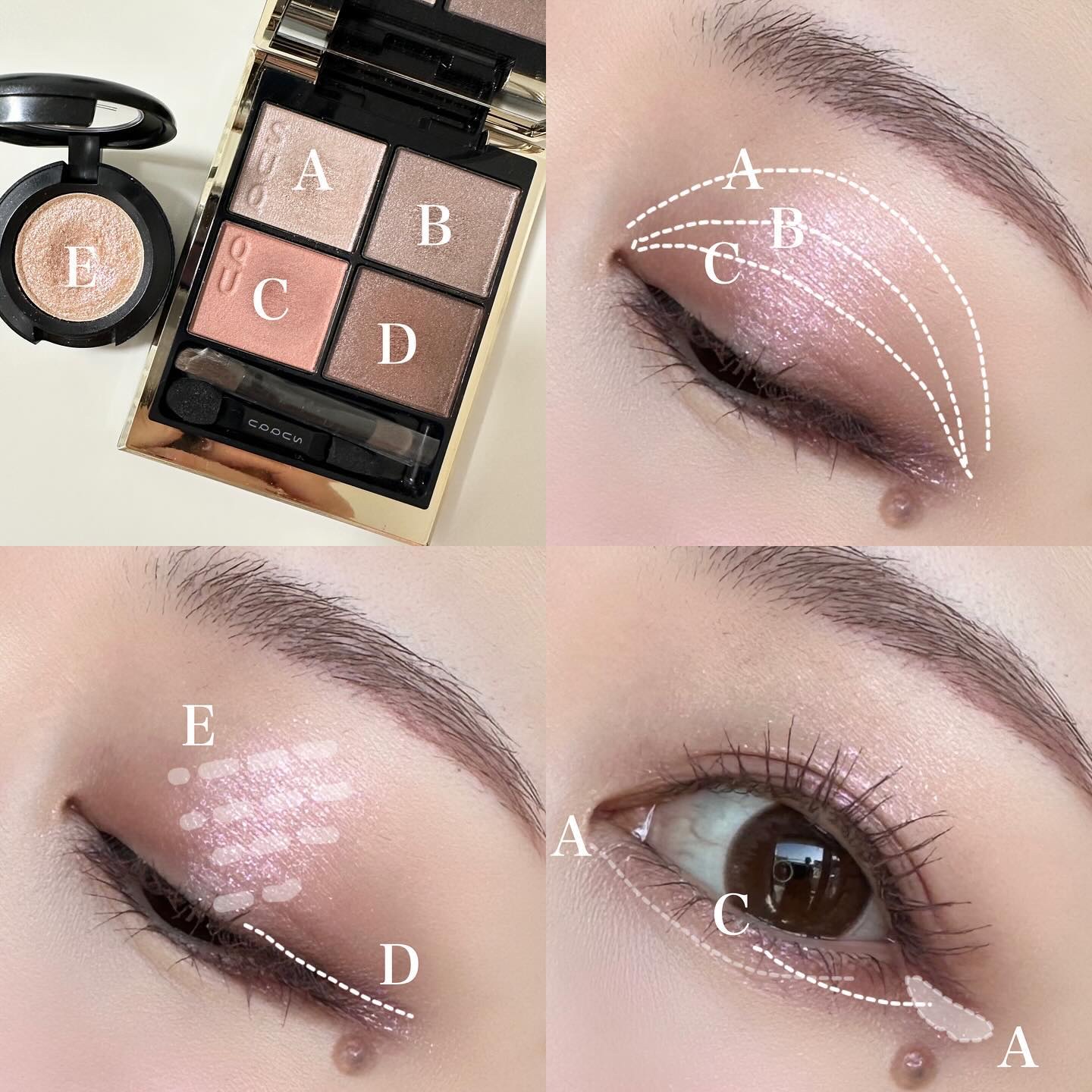 実物すごくキラキラで美しいです。 SUQQUって鮮やかな色展開のものが多いから新鮮🤍 左下のブラウンラメはザラザラ系のラメでわたしのまぶたと相性が良くなくて目の際とか少しヨレやすいかな? 普段あまり使わない色合いなので、メイクがイマイチですが、、、 実物本当に美しくてテンション上がるのでご安心を😂