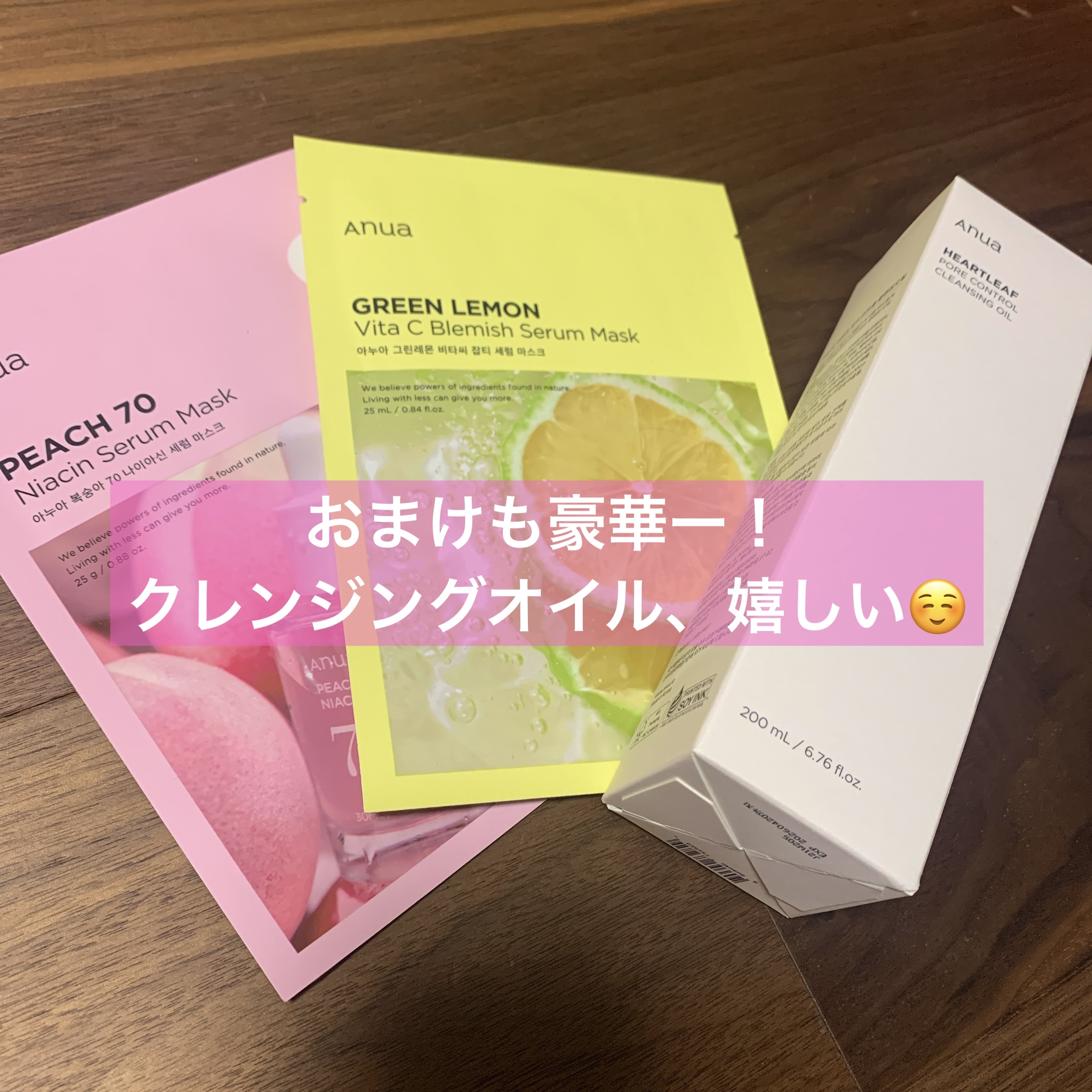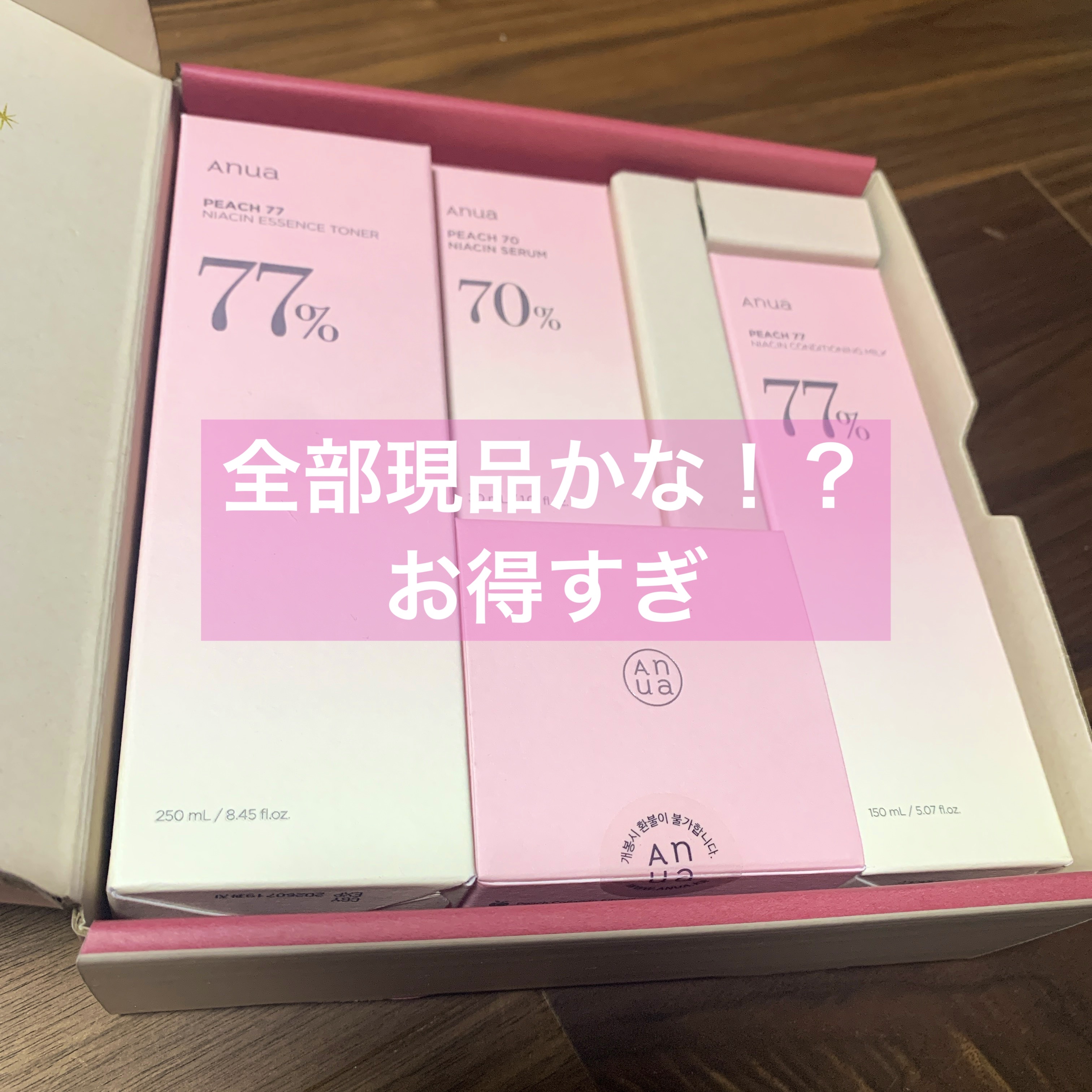 Anuaの煌めく聖夜セットは今回桃セットを購入♡ 桃77%ナイアシンエッセンストナー 250ml、Anua桃70%ナイアシンセラム、桃77%ナイアシンコンディショニングミルク、桃77%ナイアシンリッチモイスチャークリームの4つとさらに! 桃のいい香りがしてどれも当たりでした♡ 桃77%ナイアシンエッセンストナー 250mlはとてもとろっとしたテクスチャー、桃77%ナイアシンコンディショニングミルクも程よいとろっと感、桃77%ナイアシンリッチモイスチャークリームはこっくりとしたテクスチャー。 おまけのドクダミ ポアコントロールクレンジングオイルはとてもさっぱりとした使用感に感じました。メイク落ちも良い♡ Anuaのセットは毎回メガ割でありますが、今回はおまけとともにとてもお得に感じました。