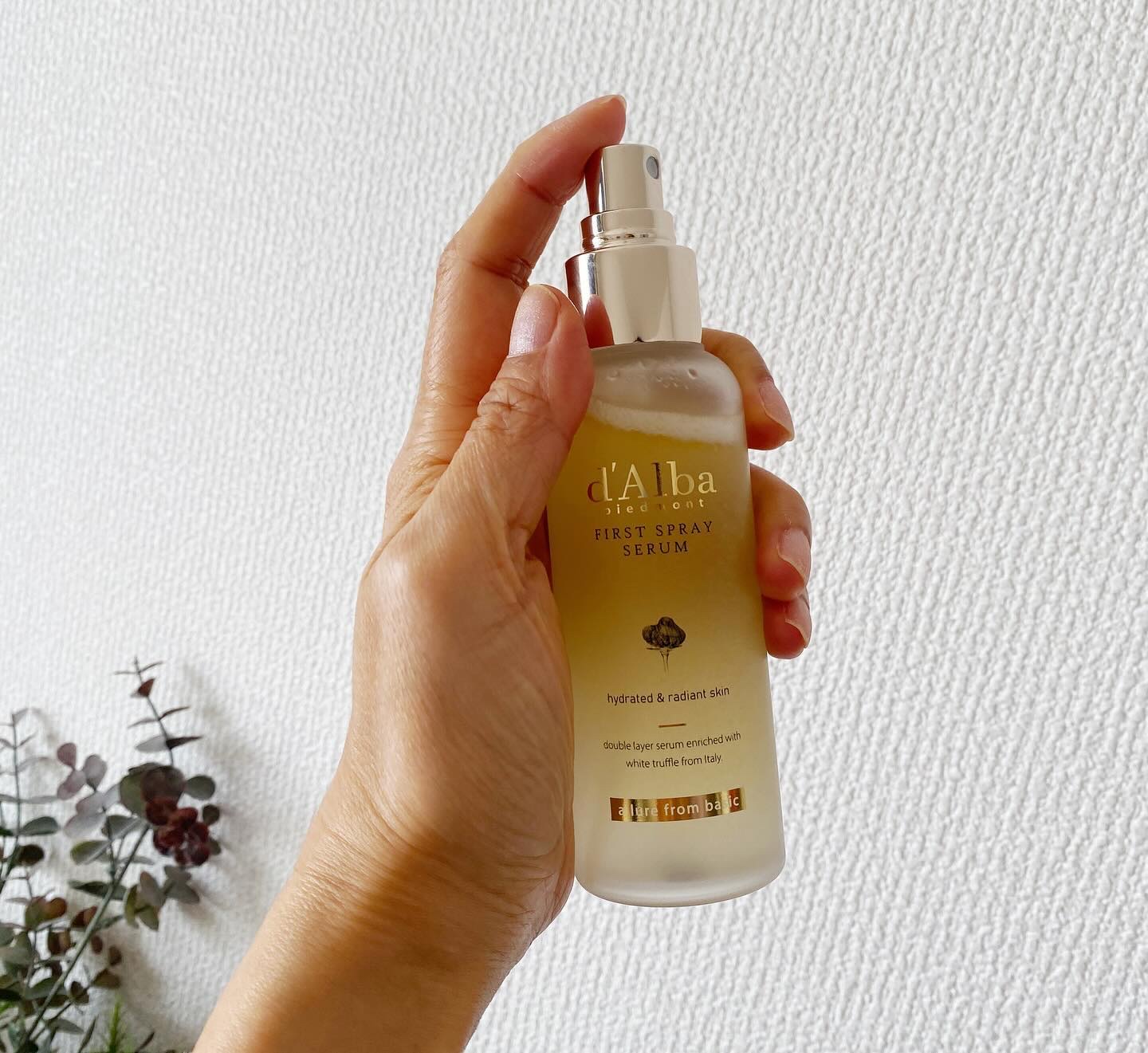- イタリア産ホワイトトリュフ*と植物性オイルで豊かな水分を与えツヤ肌に仕上げる保湿ケアミストです。肌表面の保湿だけでなく、内側までしっかり二重で保湿可能。さらにダルバ独自のトリュフェロールTMが肌に弾力を与えます。霧のような細かなミストで洗顔後やお風呂上り以外のメイクの上からでもメイクを邪魔することなく使用することができます。 *ツベルマグナツムエキス(保湿成分) イタリアヴィーガン認証V-LABEL取得 皮膚低刺激テスト済み *全ての方に皮膚刺激が発生しないということではありません。 【ご使用方法】 1. 洗顔後、3~5回振って中身が十分に混ざった後、顔全体にまんべんなく噴射して軽くたたいて肌に馴染ませます。 * 鼻や口から吸い込まないように注意してください。 【使用上の注意】 お肌に異常が生じていないかよく注意して使用してください。化粧品がお肌に合わないとき即ち次のような場合には、使用を中止してください。そのまま使用を続けますと、症状を悪化させることがありますので、皮ふ科専門医等にご相談されることをおすすめします。 (1)使用中、赤味、はれ、かゆみ、刺激、色抜け(白斑等)や黒ずみ等の異常があらわれた場合 (2)使用したお肌に、直射日光があたって(1)のような異常があらわれた場合