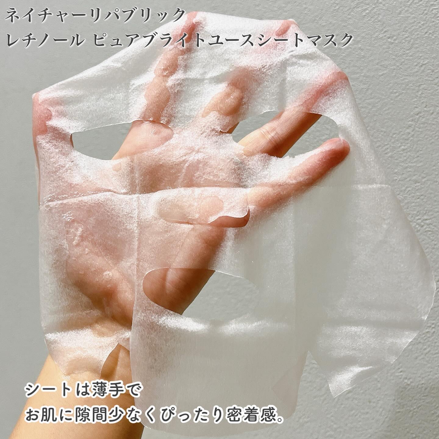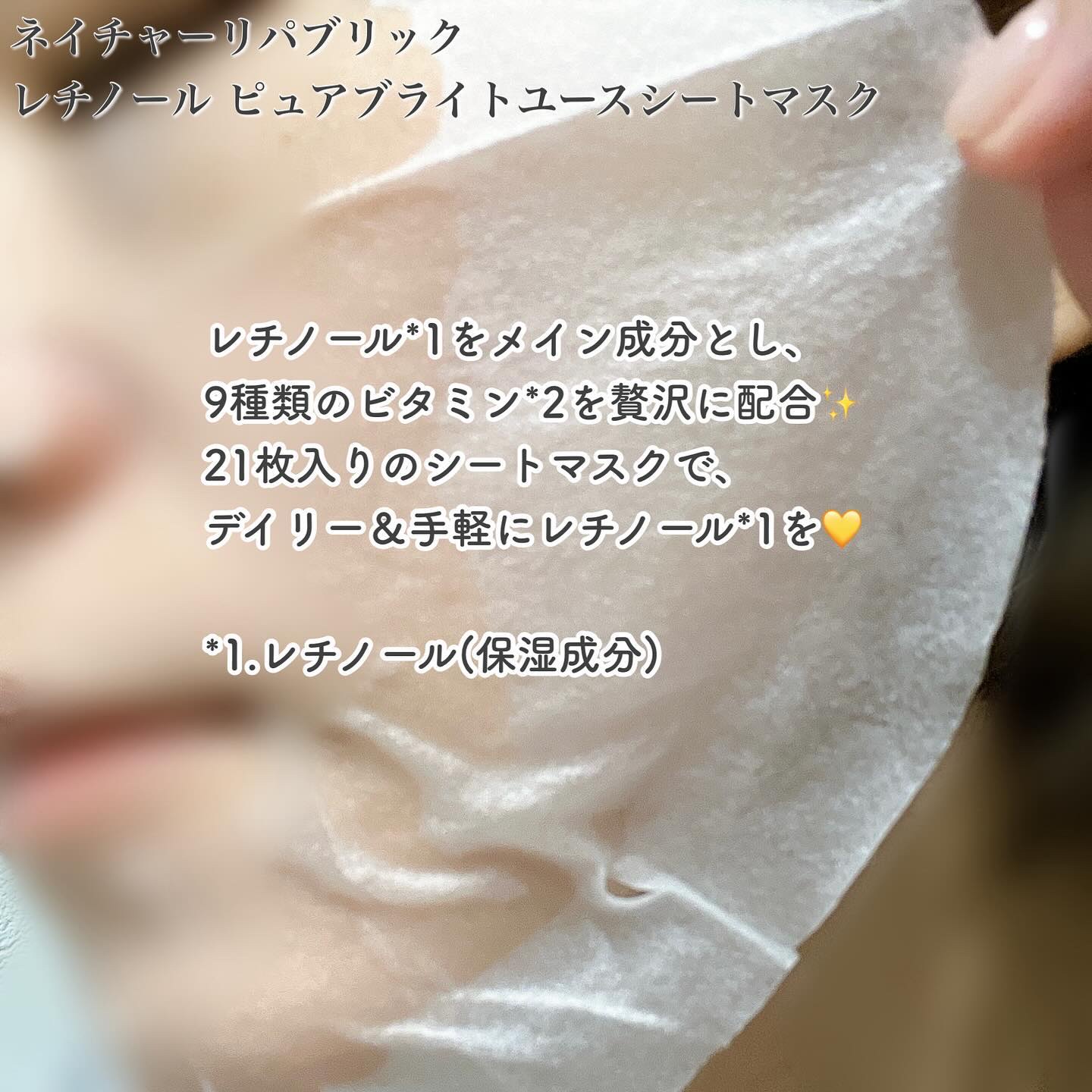 レチノール*をメイン成分とし、9種類のビタミン(*1)を配合した「レチノール* ピュアブライトユースシートマスク」。 マイルドでさっぱりした使い心地がまだまだ蒸し暑いこの季節にぴったり! 薄いシートで密着してくれる感じでとても好きな感じ◎