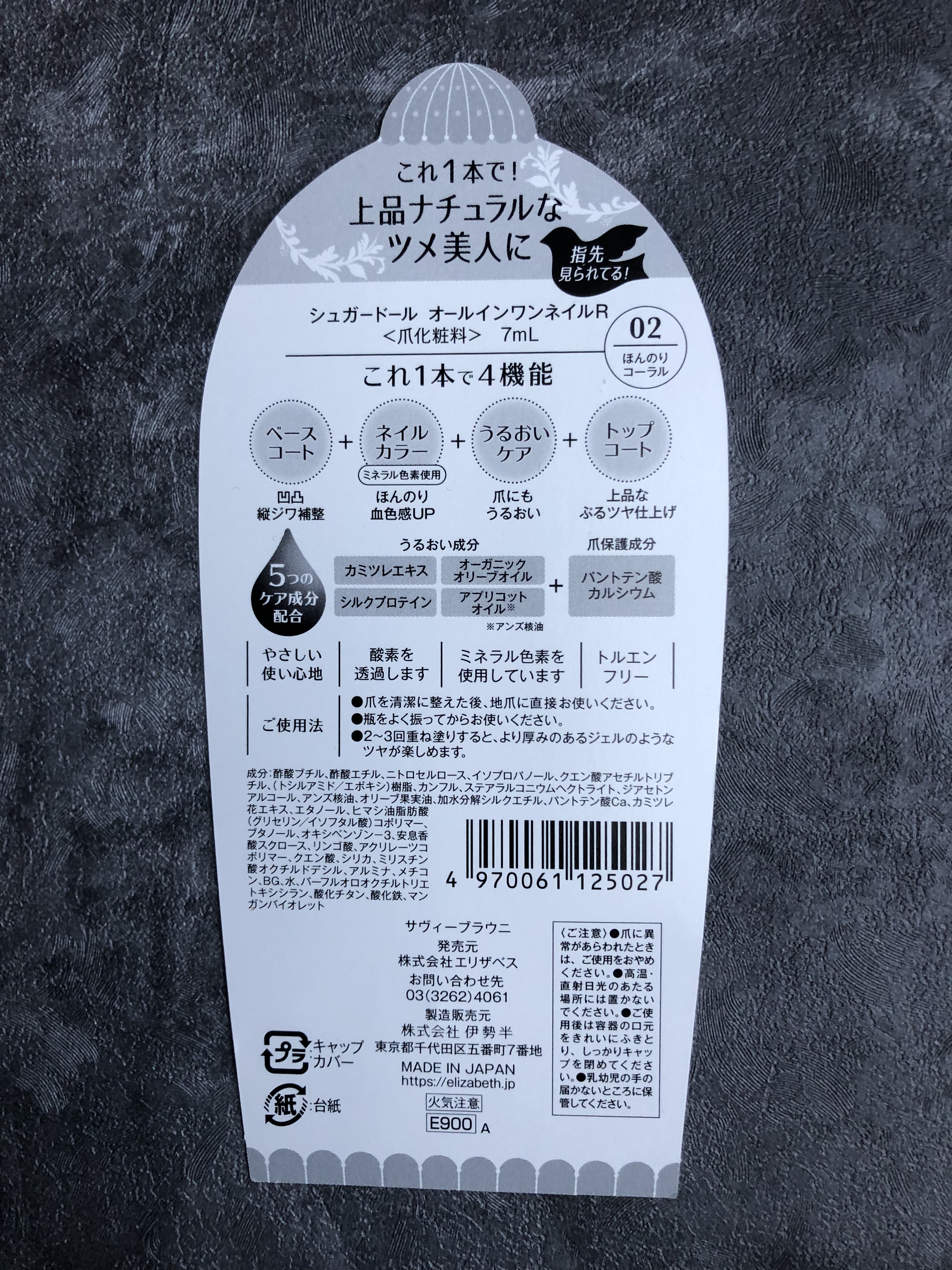 - ※パッケージ順次リニューアル。尚、リニューアルにかかる返品交換等は承っておりません。 これ1本で上品ナチュラルなツメ美人に! ひと塗りで、気になる縦ジワ・凹凸もつるんと補整し、ジェルのようなぷるツヤ仕上げ。 カンタンに、お手入れ感のある爪先がかないます。 シーンを選ばず使いやすいベーシックなカラーライナップ。 ・4つの機能が1つになったオールインワンネイル ベースコート・・・凹凸縦ジワ補整 ネイルカラー・・・ミネラル色素使用 ほんのり血色感UP うるおいケア・・・爪にもうるおい トップコート・・・上品なぷるツヤ仕上げ