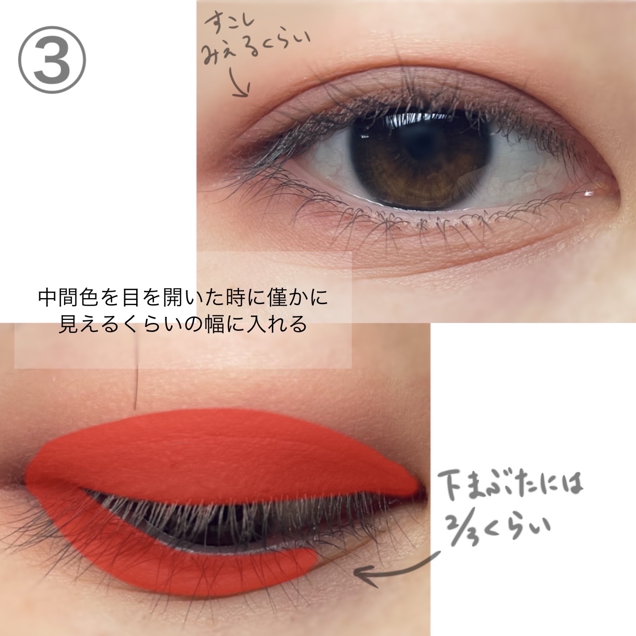 奥二重→締め色は控えめに中間色アイホール全体に 奥二重、一重→締め色を濃いめに中間色控えめ 奥二重は切長に見せたほうがいい気がするので 今回はやってませんがアイラインを長めに描くのも いい気がします すっきりさせたいので涙袋は描かないです ベースカラーの次に締め色を入れるのがポイント