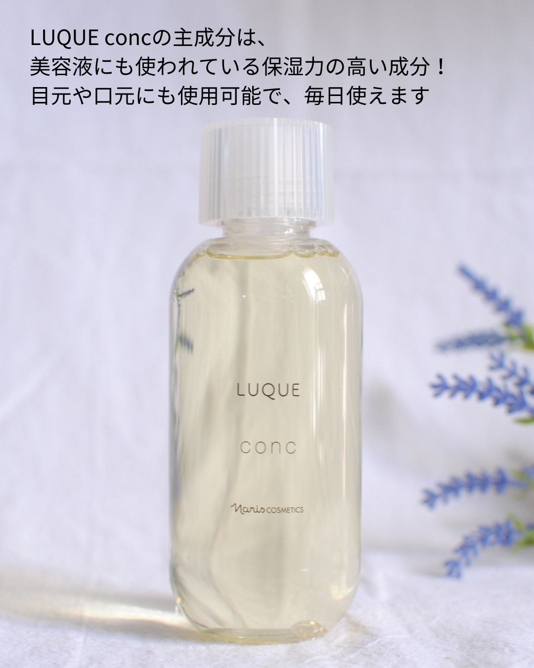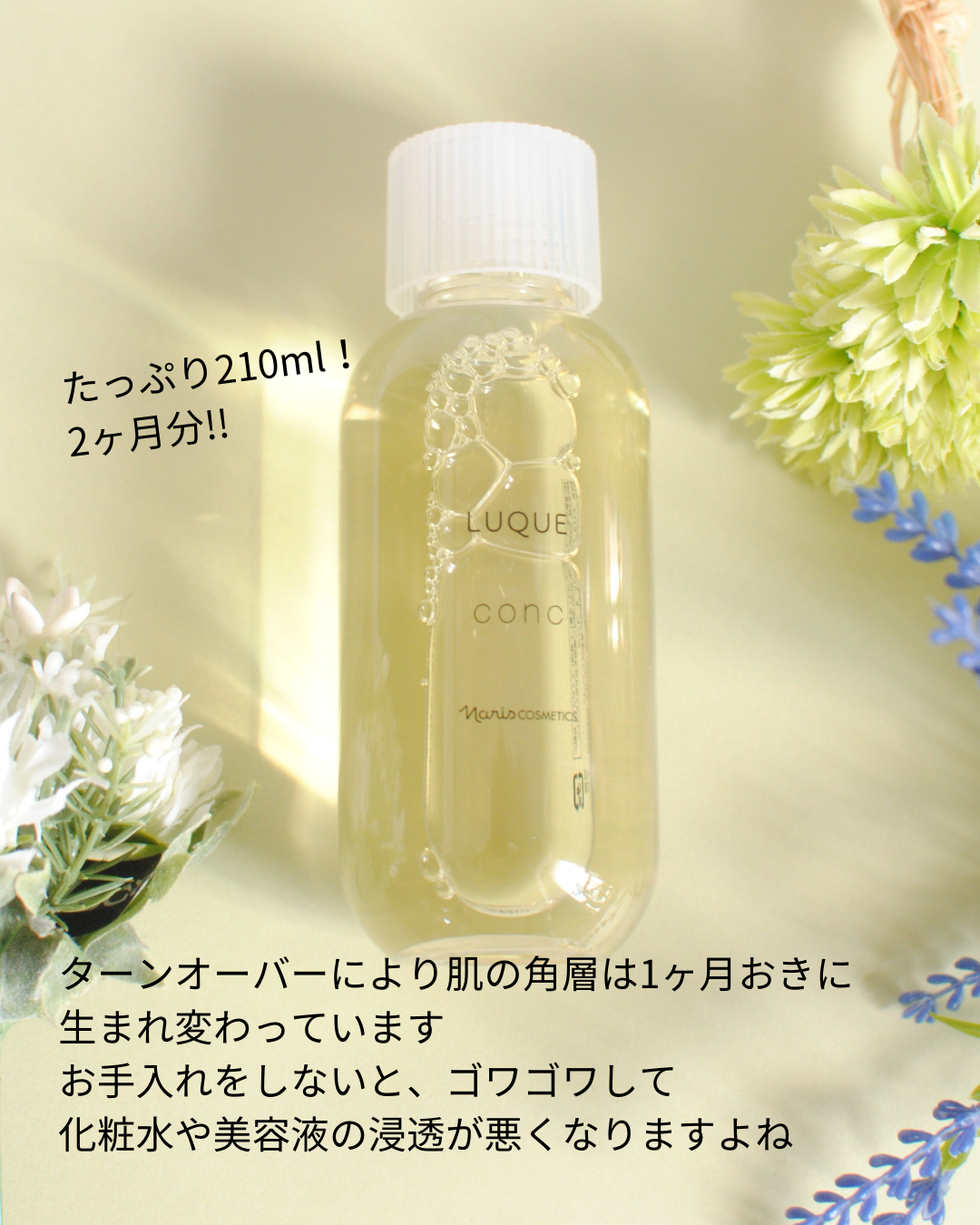 - ■毛穴、ザラつき、くすみ※1が気になる方に、不要な角質をふきとって、つるんとなめからかな肌へ。 ナリスのふきとり化粧水は、5年連続国内売上シェアNO.1※2 肌にとって余分な老化角質をおだやかに取り除き、素肌が持つ本来の美しさを引き出すルクエのコンク(ふきとり用化粧水)はナリスの80年以上続く研究開発によって誕生しました。 ●キレイのこたえは、ふきとり化粧水という選択。 植物保湿成分で古い角質をやさしくオフして、次に使うスキンケアアイテムのなじみをサポート。日々変化する肌をすこやかに整えます。毎日の“ふきとり習慣”で理想の肌に近づきましょう。 ●厳選した3つの植物の力で角層ケアをサポート。 ・柔らかくほぐして、取り除きやすくする「ヨクイニンエキス」※3 ・潤いを与え、健康的な角層へ導く「月見草エキス」※4 ・潤いを逃さず閉じ込める「白花豆エキス」※5 【使用方法】 1. 朝晩2回、洗顔後の後に。 2. コットンに8〜10滴程度(500円玉大)を含ませます。目安は、コットン裏側に染み込む程度。 3. できるだけ力を入れずに、やさしくなでるように顔全体を拭き取ります。 ※1古い角質による ※2ナリス化粧品 2015~2019年度 「ふきとり用化粧水」販売動向調査 TPCマーケティングリサーチ株式会社調べ※3 ハトムギ種子エキス(保湿成分) ※4 メマツヨイグサ種子エキス(保湿成分) ※5ベニバナインゲン種子エキス(保湿成分)