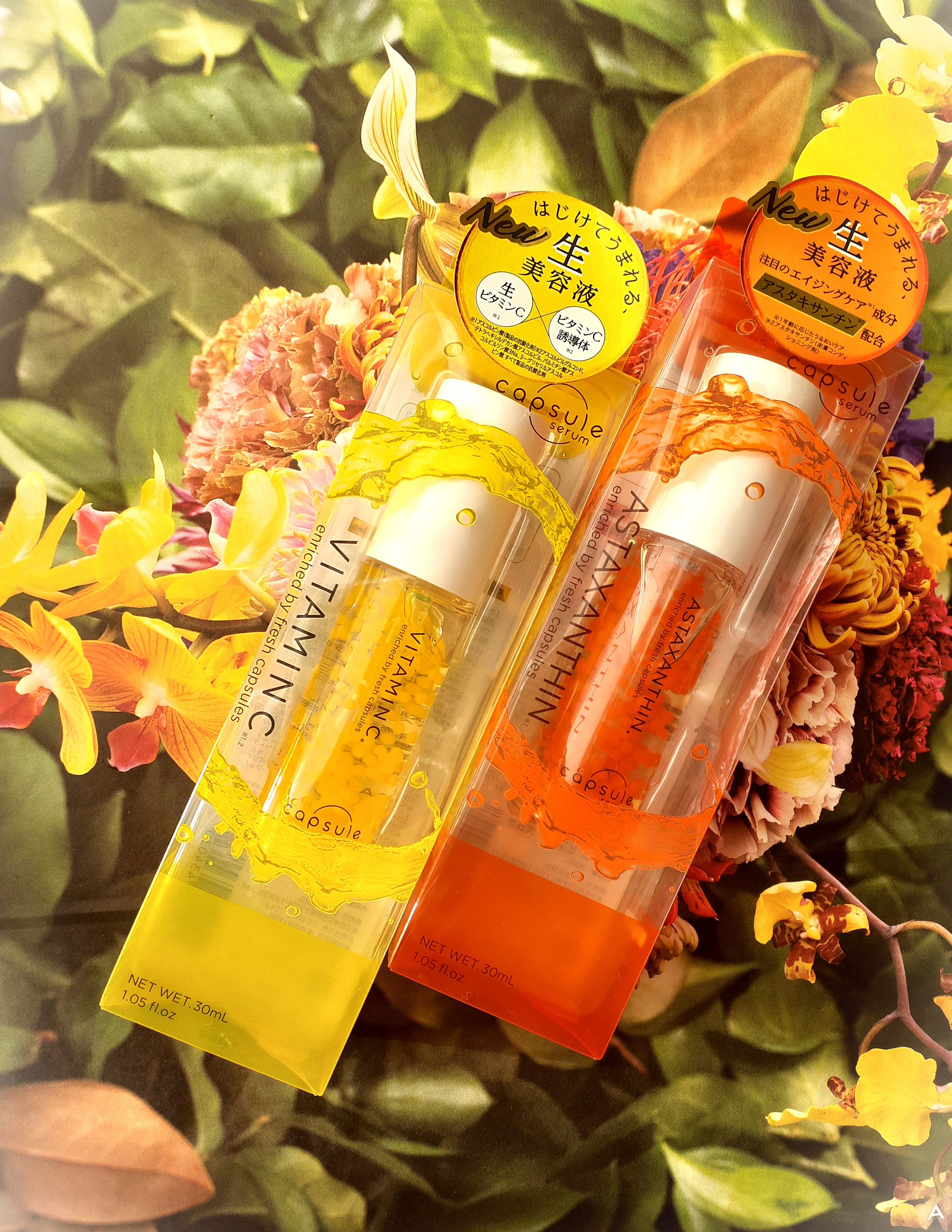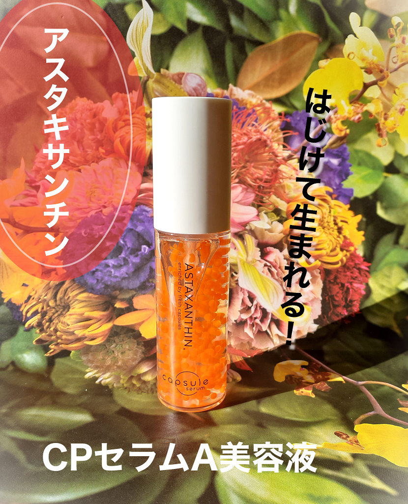 注目のエイジングケア成分アスタキサンチンを厳選配合 独自のカプセル製法によって成分が酸化しづらくなっていて出した時にカプセルが弾けて新鮮な美容成分を肌に届けることができるというセラム アスタキサンチンだけでなくビタミンC誘導体も配合されていてより相乗効果が期待できるよ