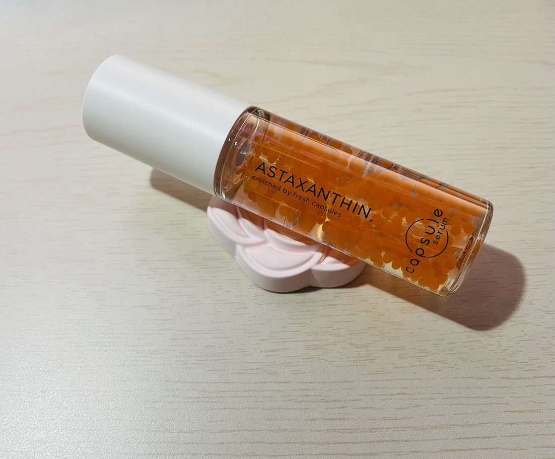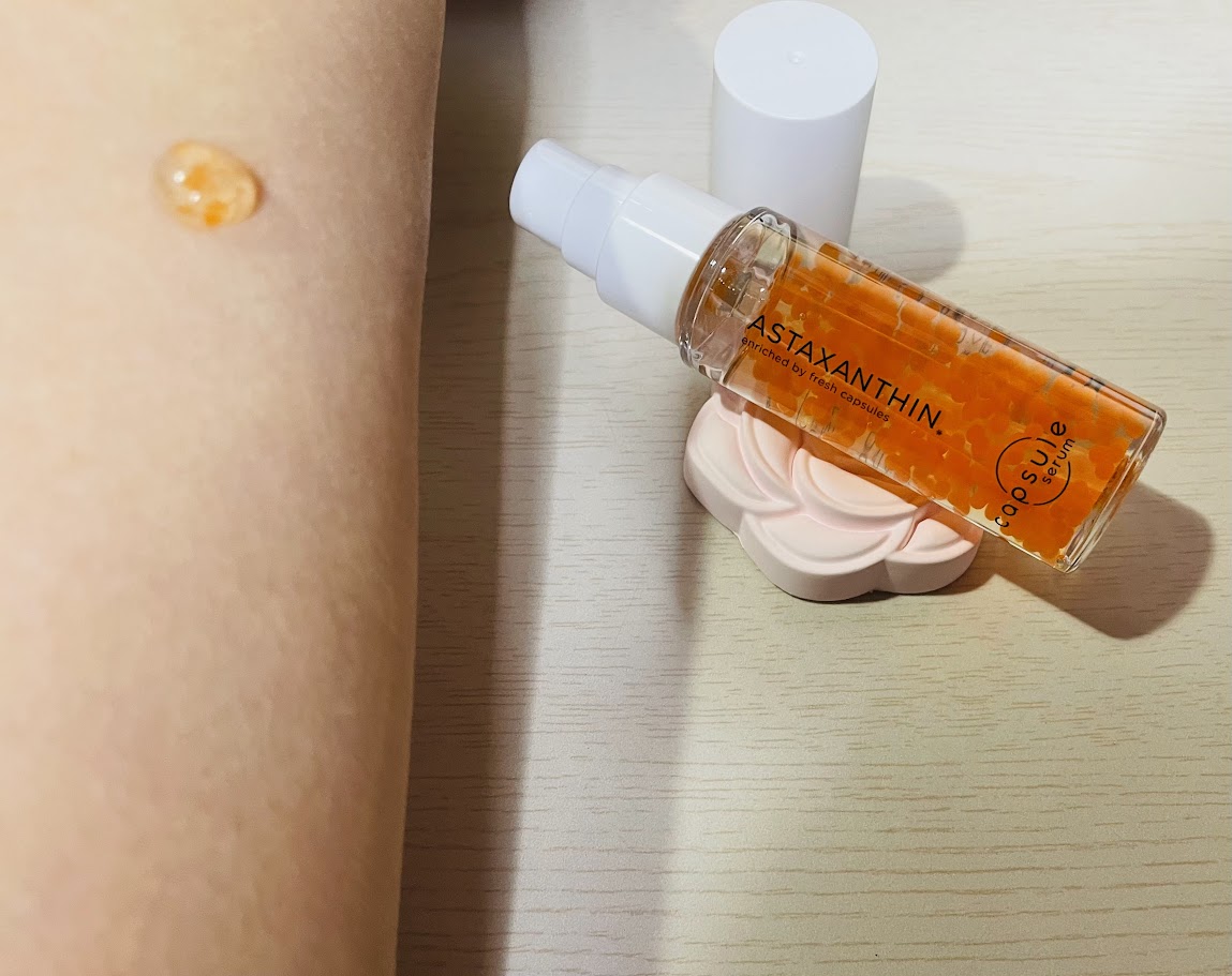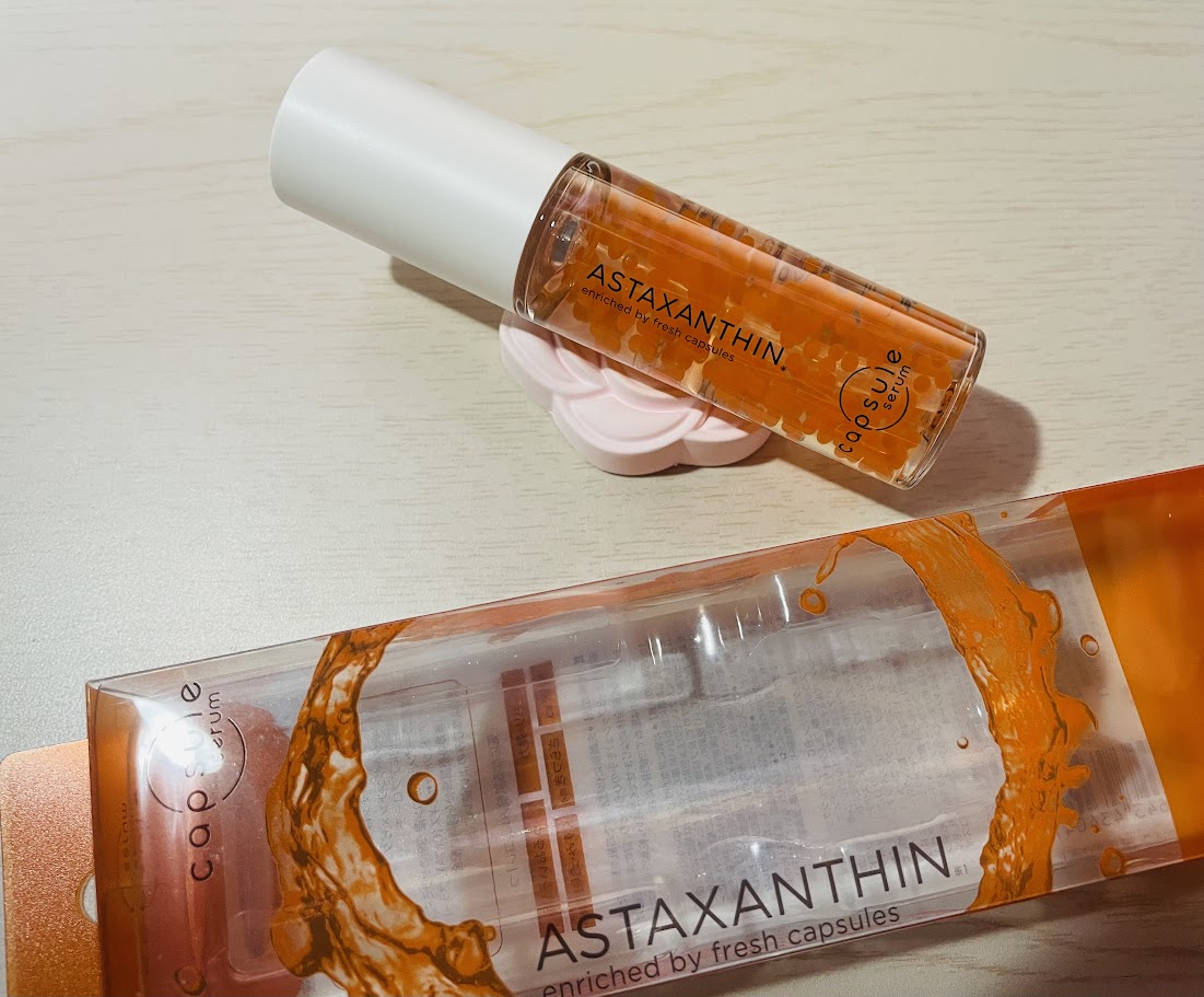 注目のエイジングケア成分アスタキサンチンを厳選配合 独自のカプセル製法によって成分が酸化しづらくなっていて出した時にカプセルが弾けて新鮮な美容成分を肌に届けることができるというセラム アスタキサンチンだけでなくビタミンC誘導体も配合されていてより相乗効果が期待できるよ