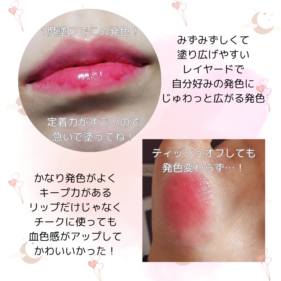 使用感は、とろけるような柔らかさと すっと馴染む伸びの良さが魅力的です! イエベの3色は、ティッシュオフをすると 特にコーラル味が増して、とてもかわいいです! ブルベの3色は、私自身がブルベなのもありますが 元々こんな唇の色だよ🥰ってくらい自然に馴染みました💛 カラーステイもとても期待できます😌 腕のスウォッチ…消えるかな…?💦笑 1度塗りして、ティッシュオフしてから 内側にもう1回塗ると、可愛いグラデが作れます💗