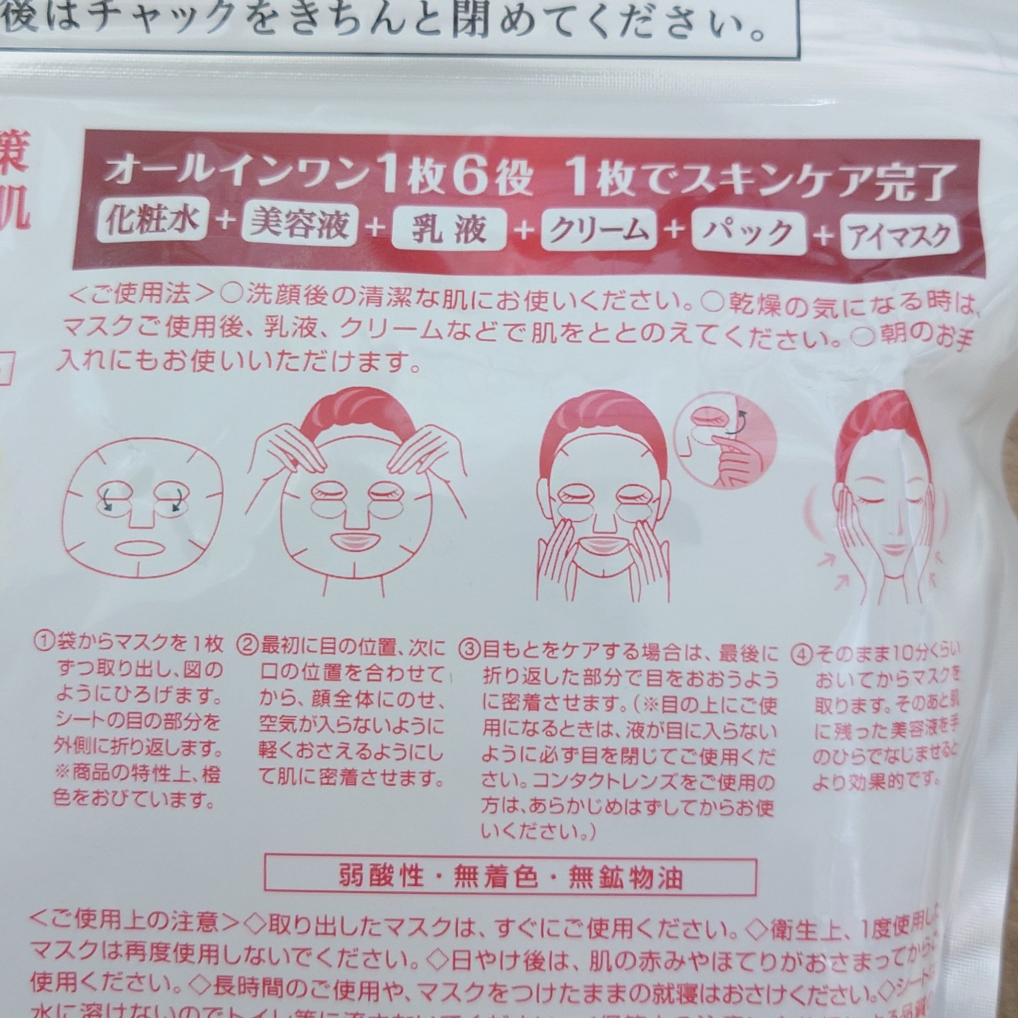 - 美白有効成分「ナイアシンアミド」を配合、 うるおいチャージ成分で乾燥小じわも目立たせない。 化粧水+美容液+乳液+クリーム+パック+アイマスクの 効果を1枚で。
