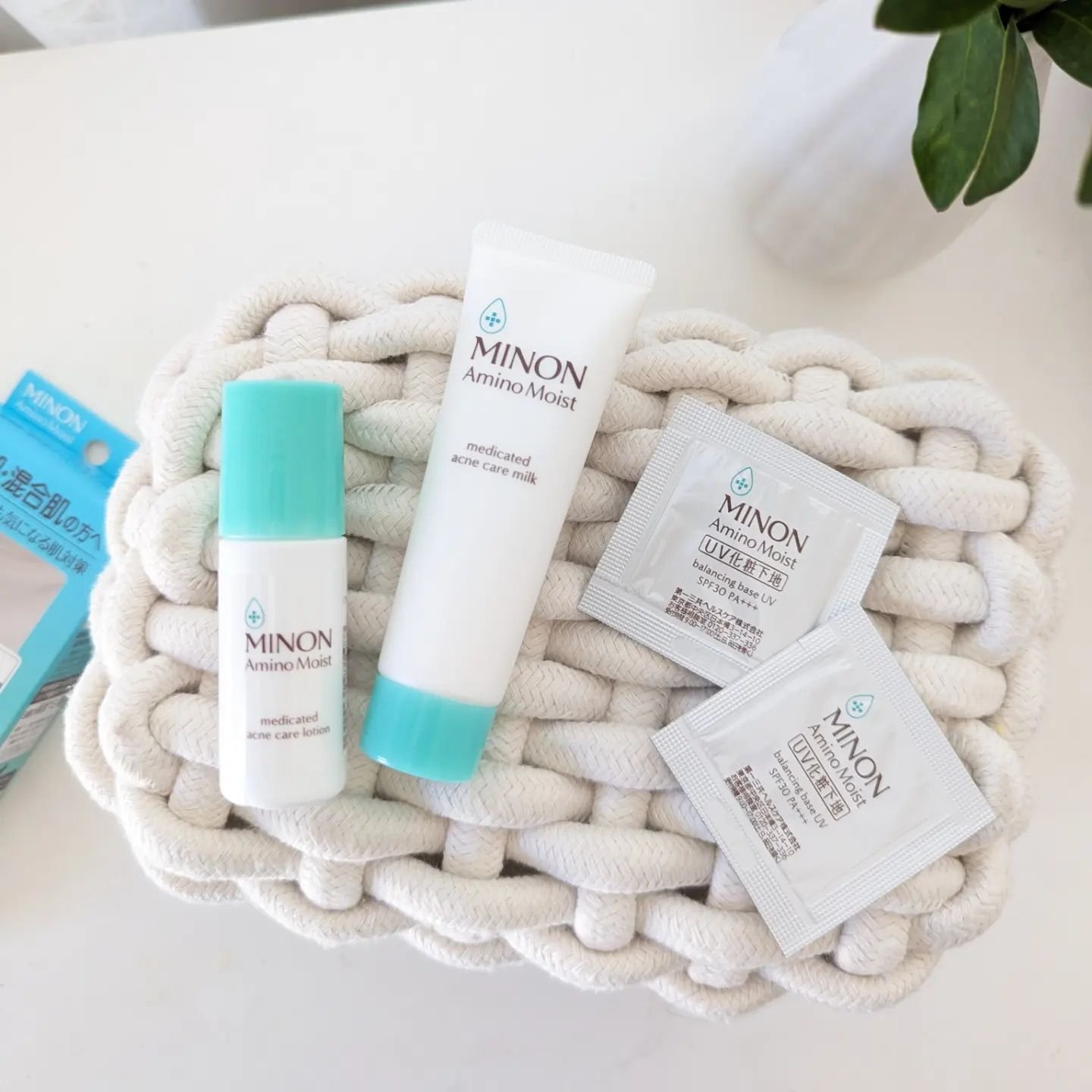 - さらっとうるおい実感セット。乾燥もテカリも気になる肌へ。 約10日分*ミニサイズ 〈セット品〉 薬用アクネケア ローション[保湿化粧水](販売名:ミノンアミノモイストBL)【医薬部外品】20mL 薬用アクネケア ミルク[保湿乳液](販売名:ミノンアミノモイストBM)【医薬部外品】20g + バランシングベース UV[UV化粧下地]0.5g×2包 *バランシングベース UVは2回分