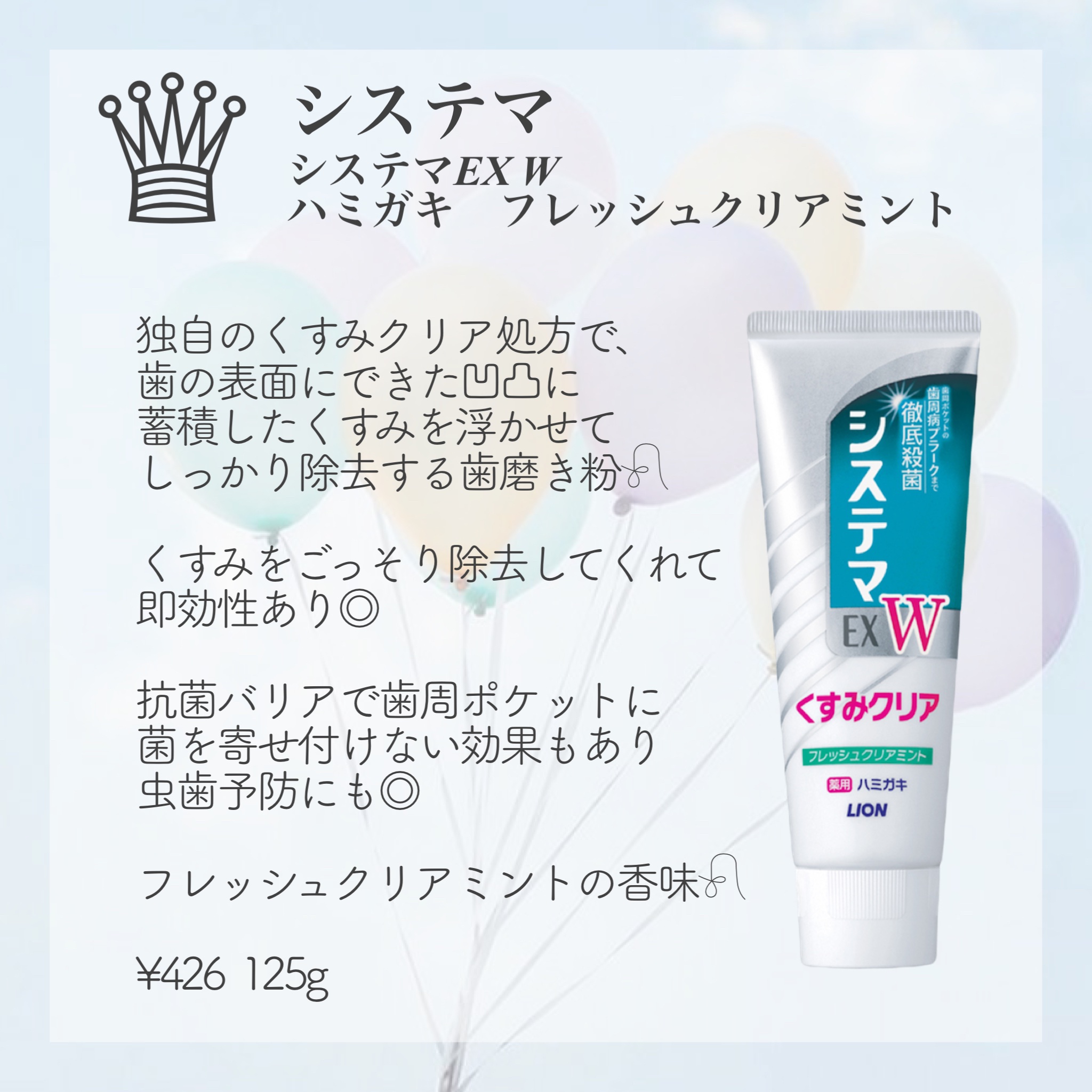 ホワイトニングに高くて通えなくても歯磨き粉で毎日ケアができるんです! ホワイトニング効果の高いすぐに買える歯磨き粉を5つご紹介します𓃹♡ 固着したミクロレベルの沈着汚れを浮かして落としやすくします𓃹 歯を白くしつつ、虫歯も予防◎口臭の防止、歯の白色度UPの効果もあるのでデイリー使いに◎ 4つの力で歯を白くするホワイトニング歯磨き粉です♡ 弱アルカリ性のペーストがステインを浮かし、歯にやさしいLime粒子がステインを落とします𓍯 ホワイトニング成分の「過酸化水素水」が含まれおり、ブラッシングにより歯を白くする効果が◎ 独自のくすみクリア処方で、歯の表面にできた凹凸に蓄積したくすみを浮かせてしっかり除去する歯磨き粉𓍯 くすみをごっそり除去してくれて即効性あり◎抗菌バリアで歯周ポケットに菌を寄せ付けない効果もあり虫歯予防にも◎