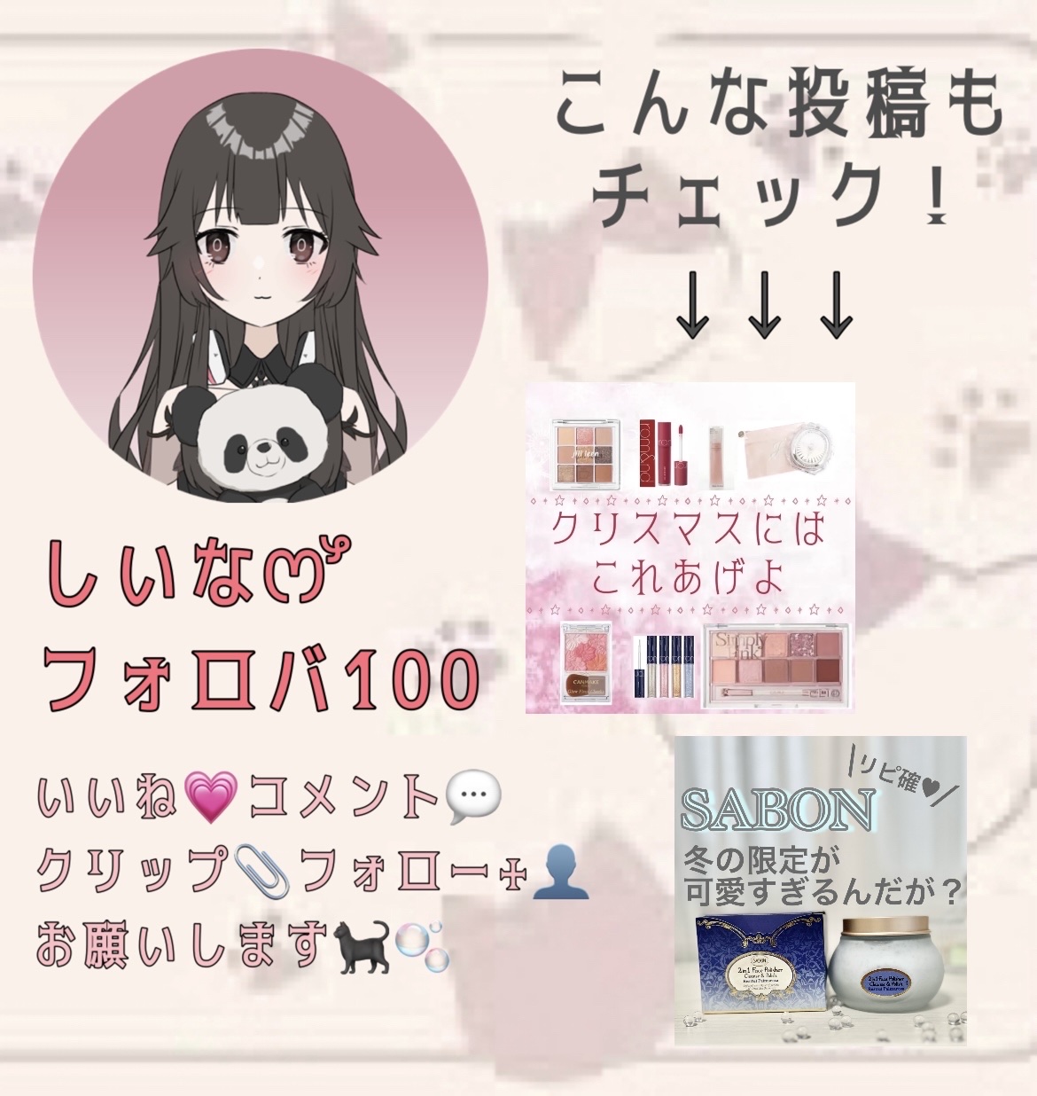 クリスマスなので女の子が大好きなキラキラした可愛いパケのアイテムを選んでいます! 自分のご褒美用にもおすすめです♡ 【〜1000円】 ・CANMAKE グロウフルールチークス ・無印良品 リップエッセンス 【〜2000円】 ・rom&nd リキッドグリッターシャドウ ・rom&nd ゼロベルベットティント ・Jill leen シャイニングミニアイシャドウパレット 【〜3000円】 ・JILL STUART コンパクトミラー 【〜5000円】 ・CLIO プロアイパレット ・SABON フェイスポリッシャー