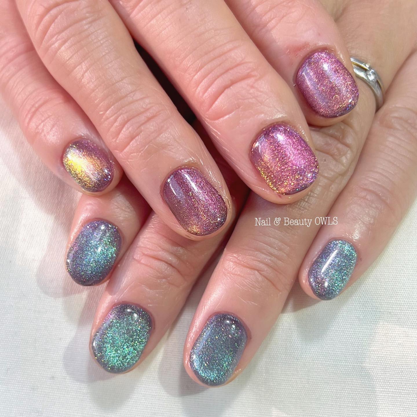 ほんのり発色の桜マグネット🧲🌸 肌馴染みの良いちょっぴりくすんだピンクカラーのフラワーアートデザイン✨ くすみピンクにライトゴールドの粒子がとっても可愛いですよ😍💕 桜マグネット03を塗布し動かし硬化 ↑2回繰り返す ベルベットを塗布し硬化