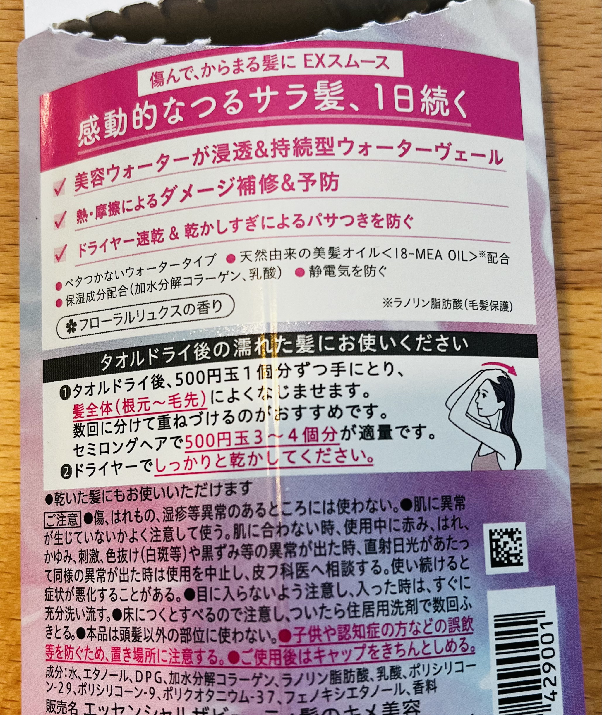 - ※2025年9月6日〜順次パッケージと香りをリニューアル。尚、リニューアルにかかる返品交換等は承っておりません。 傷んで、からまる髪に。 洗い流さないウォータートリートメント。 美容ウォーターが浸透。 持続型ウォーターヴェールで、感動的なつるサラ髪、1日続く。 〇熱・摩擦によるダメージ補修&予防 〇ドライヤー速乾&乾かしすぎによるパサつきを防ぐ 〇厳選した補修美容成分配合<天然由来の美髪オイル18-MEA OIL(ラノリン脂肪酸)・加水分解コラーゲン・乳酸> 〇静電気を防ぐ 〇ときめくホワイトピーチ&ムスクの香り