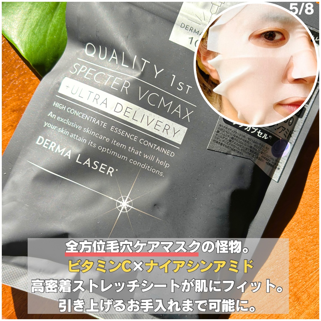 ダーマレーザースペクター VCMAXマスクZ 毛穴*2やざらつき、気になる肌悩みにアプローチ。成分の力を最大限活かす進化型浸透システムと、最高級*1の3層構造&厚切りエクストリームシートを採用。 特に刺激も感じず、3分ではがすとツヤツヤ✨ ちょっとペタペタするけどハンドプレスしていくともっちりしっとり 肝心の肌のコンデイションもとても良かったからここぞという時に使いたい😂スペシャルケアに取り入れて欲しいマスクです😊
