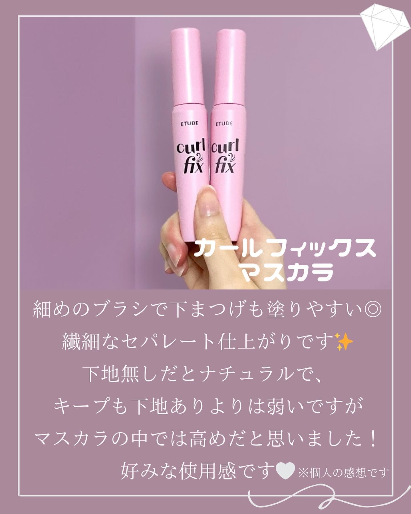 ETUDEカールフィックスマスカラボリュームブラックエチュードの人気マスカラの束感+ボリュームに特化したタイプ!繊維はなしで、塗り重ねてもダマになりにくく、束感とボリューム感が簡単に出せる😳ブラシはゆるやかなカーブで、先端は細くなってるから上...