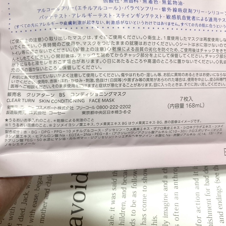 - 【クリアターン ごめんね素肌マスク】 負担をかけて、あれてしまった肌の素肌環境※1をととのえる“速攻集中リペア※2マスク”です。 ① あれがちな肌を素早くコンディションケア! ザクロエキス、桜エキス※3、ウメ果実エキスBG配合し、ゆらぎやすい肌環境をととのえ、肌あれをケアします。また、うるおいケア成分として、ヒアルロン酸、白キクラゲ多糖体BGを配合。外的ストレス※4や不規則な生活の影響を受けやすい肌も健やかでゆらぎにくい肌へみちびきます。 ②敏感肌も使える、弱酸性・低刺激処方 無香料・無着色・無鉱物油・アルコールフリー(エチルアルコール)・パラベンフリー・紫外線吸収剤フリー・シリコーンフリー・パッチテスト済み・アレルギーテスト済み・スティンギングテスト済み・敏感肌自覚者による連用テスト済み(すべての方にアレルギーや皮膚刺激が起きない、刺激感がないというわけではありません。すべての方の肌に合うということではありません。) ③角質ケアもできる!凸凹高密着シート コットン生まれのやわらかな肌触りのベンリーゼを使用。 表面に凸凹のエンボス加工を施しているため、密着性が高く、はがしたマスクでやさしく顔をふきとることで角質ケアもできます。 ※1 うるおい環境のこと ※2 うるおいお手入れのこと ※3 ソメイヨシノ葉エキス、ウメ果実エキスBGはウメ果実エキス・BG(保湿) ※4 乾燥による刺激のこと