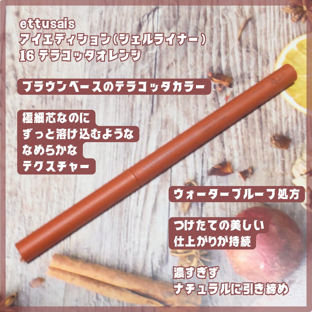 ettusaisのアイエディション カラーパレット21アプリコットチュールはPC問わず使えるコーラルベージュシャドウ×多色パール入りのパープルシャドウのパレット🫶 ラスティング ジェルライナー18アプリコットブラウンはアプリコットカラーな春色ブラウンライナー🌸 温かみのある使いやすいカラーだよ✨️