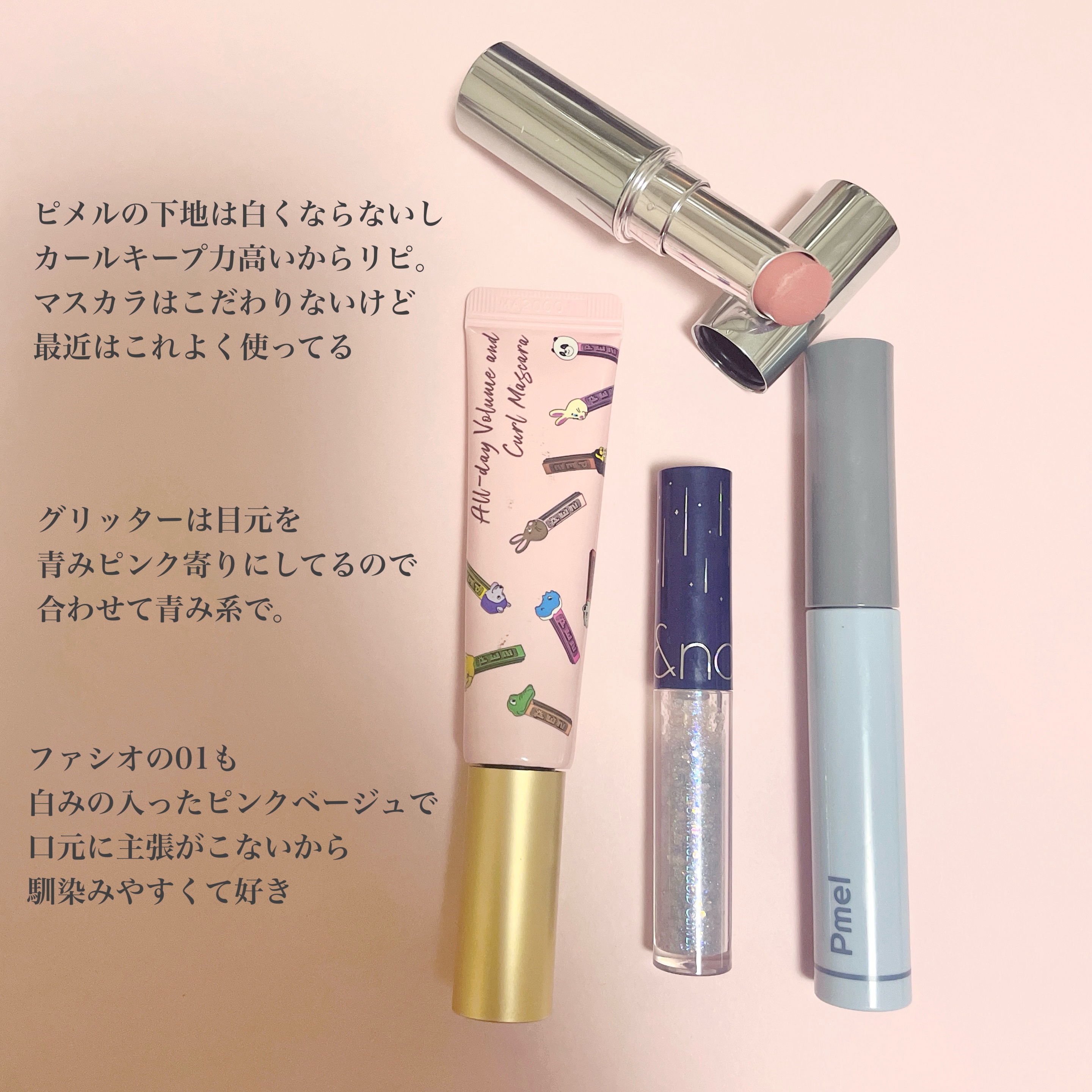私が購入したのは003のピンクカラーです。 これ、公式インスタで7月に見かけてからずーーーーーっと気になってました。 ニュートラルなベビーピンク。 薄く淡い見た目で桜カラーと呼んでも良さそう。 時間経過しても残ってるのはピンクでした。 パール感はやはり8時間外出×マスク×化粧直しなしのズボラ日では薄まってましたが、許容範囲。