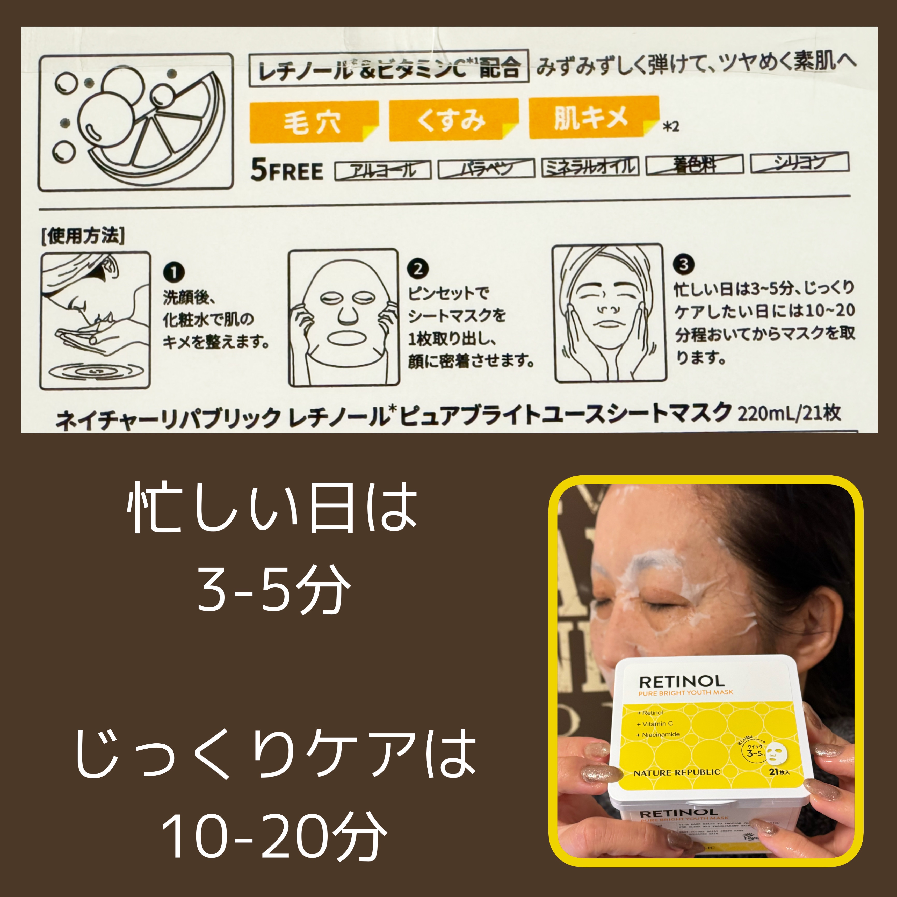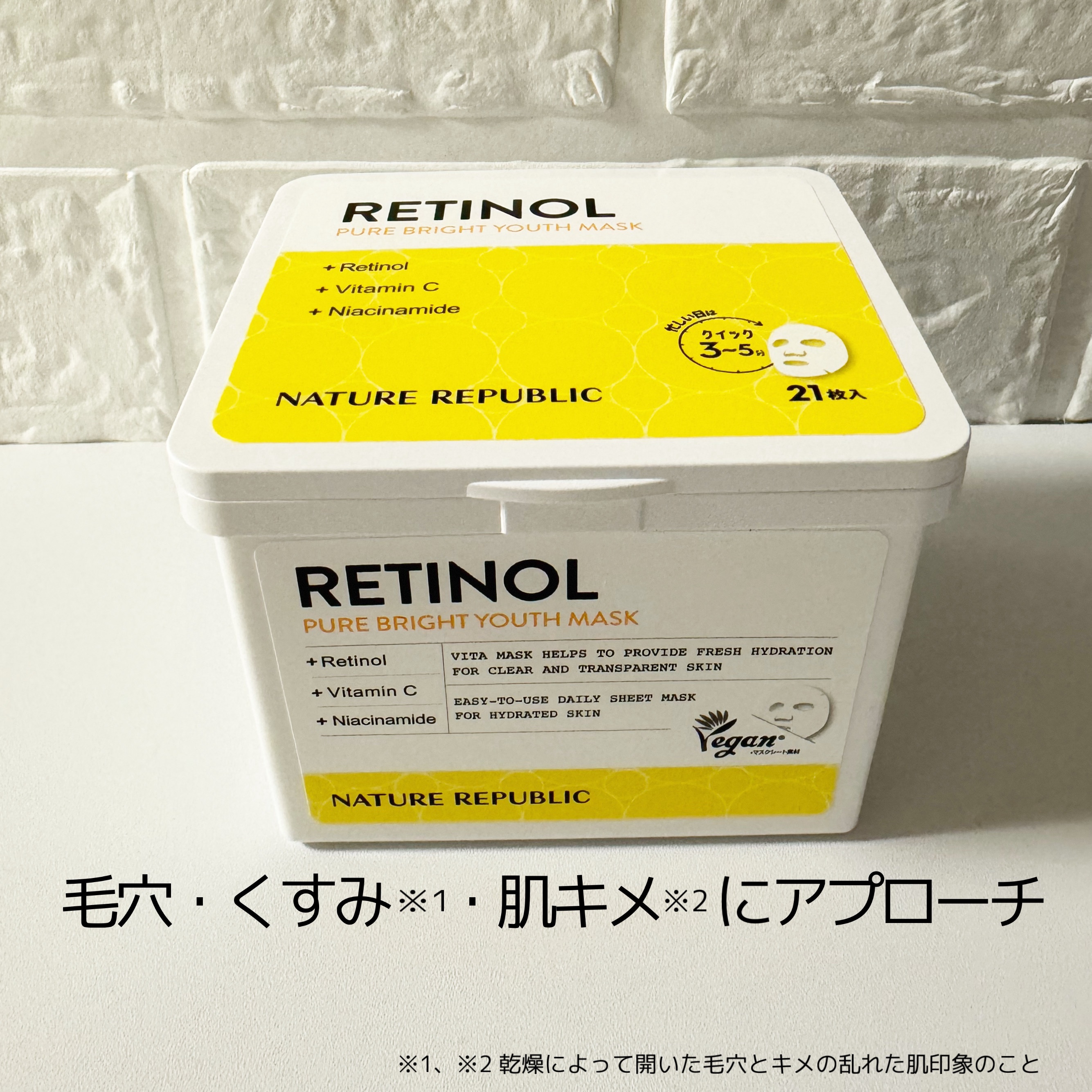 レチノール*をメイン成分とし、9種類のビタミン(*1)を配合した「レチノール* ピュアブライトユースシートマスク」。 マイルドでさっぱりした使い心地がまだまだ蒸し暑いこの季節にぴったり! 薄いシートで密着してくれる感じでとても好きな感じ◎