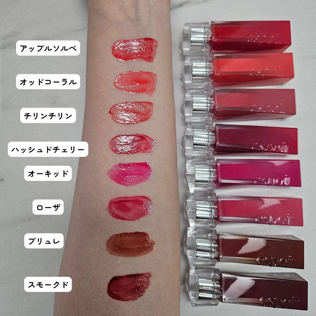 - <アップルシャーベット> 水、リンゴ酸ジイソステアリル、ビスジグリセリルポリアシルアジペート-2、ダイマージリノール酸ダイマージリノレイルビス(ベヘニル/イソステアリル/フィトステリル)、水添ポリイソブテン、ジグリセリン、ジフェニルジメチコン、セチルPEG/PPG-10/1ジメチコン、トリメチルシロキシフェニルジメチコン、ポリソルベート60、ペンチレングリコール、イソステアリン酸ソルビタン、イソステアリン酸ポリグリセリル-4、フェノキシエタノール、(アクリル酸ヒドロキシエチル/アクリロイルジメチルタウリンNa)コポリマー、セテアレス-20、スクワラン、香料、ジラウラミドグルタミドリシンNa、エチルヘキシルグリセリン、エチレンジアミンジコハク酸3Na、黄5、赤227、赤104(1)、黄4 <オッドコーラル> 水、リンゴ酸ジイソステアリル、ダイマージリノール酸ダイマージリノレイルビス(ベヘニル/イソステアリル/フィトステリル)、ビスジグリセリルポリアシルアジペート-2、水添ポリイソブテン、ジフェニルジメチコン、ジグリセリン、セチルPEG/PPG-10/1ジメチコン、トリメチルシロキシフェニルジメチコン、ポリソルベート60、ペンチレングリコール、イソステアリン酸ソルビタン、イソステアリン酸ポリグリセリル-4、フェノキシエタノール、セテアレス-20、(アクリル酸ヒドロキシエチル/アクリロイルジメチルタウリンNa)コポリマー、スクワラン、香料、ジラウラミドグルタミドリシンNa、エチルヘキシルグリセリン、エチレンジアミンジコハク酸3Na、水酸化Al、ポリアクリル酸アンモニウム、BG、酸化チタン、黄5、赤104(1)、黄4、赤227、青1 <チリンチリン> 水、リンゴ酸ジイソステアリル、ダイマージリノール酸ダイマージリノレイルビス(ベヘニル/イソステアリル/フィトステリル)、ビスジグリセリルポリアシルアジペート-2、水添ポリイソブテン、ジグリセリン、ジフェニルジメチコン、セチルPEG/PPG-10/1ジメチコン、トリメチルシロキシフェニルジメチコン、ポリソルベート60、ペンチレングリコール、イソステアリン酸ソルビタン、イソステアリン酸ポリグリセリル-4、フェノキシエタノール、セテアレス-20、(アクリル酸ヒドロキシエチル/アクリロイルジメチルタウリンNa)コポリマー、スクワラン、香料、ジラウラミドグルタミドリシンNa、エチルヘキシルグリセリン、エチレンジアミンジコハク酸3Na、水酸化Al、ポリアクリル酸アンモニウム、BG、酸化チタン、黄5、赤227、黄4、赤104(1)、青1 <ハッシュドチェリー> 水、リンゴ酸ジイソステアリル、ビスジグリセリルポリアシルアジペート-2、ダイマージリノール酸ダイマージリノレイルビス(ベヘニル/イソステアリル/フィトステリル)、水添ポリイソブテン、ジグリセリン、ジフェニルジメチコン、トリメチルシロキシフェニルジメチコン、セチルPEG/PPG-10/1ジメチコン、ポリソルベート60、ペンチレングリコール、イソステアリン酸ソルビタン、イソステアリン酸ポリグリセリル-4、フェノキシエタノール、セテアレス-20、(アクリル酸ヒドロキシエチル/アクリロイルジメチルタウリンNa)コポリマー、スクワラン、香料、ジラウラミドグルタミドリシンNa、エチルヘキシルグリセリン、エチレンジアミンジコハク酸3Na、赤227、黄5、黄4、赤104(1)、青1 <ローザ> 水、リンゴ酸ジイソステアリル、ダイマージリノール酸ダイマージリノレイルビス(ベヘニル/イソステアリル/フィトステリル)、ビスジグリセリルポリアシルアジペート-2、水添ポリイソブテン、ジグリセリン、ジフェニルジメチコン、トリメチルシロキシフェニルジメチコン、セチルPEG/PPG-10/1ジメチコン、ポリソルベート60、ペンチレングリコール、イソステアリン酸ソルビタン、イソステアリン酸ポリグリセリル-4、フェノキシエタノール、セテアレス-20、(アクリル酸ヒドロキシエチル/アクリロイルジメチルタウリンNa)コポリマー、スクワラン、香料、ジラウラミドグルタミドリシンNa、エチルヘキシルグリセリン、エチレンジアミンジコハク酸3Na、酸化チタン、赤227、赤104(1)、黄4、黄5、水酸化Al、ポリアクリル酸アンモニウム、BG、青1 <ピンキーローキー> 水、リンゴ酸ジイソステアリル、ダイマージリノール酸ダイマージリノレイルビス(ベヘニル/イソステアリル/フィトステリル)、ビスジグリセリルポリアシルアジペート-2、水添ポリイソブテン、ジグリセリン、ジフェニルジメチコン、トリメチルシロキシフェニルジメチコン、セチルPEG/PPG-10/1ジメチコン、ポリソルベート60、ペンチレングリコール、イソステアリン酸ソルビタン、イソステアリン酸ポリグリセリル-4、フェノキシエタノール、セテアレス-20、(アクリル酸ヒドロキシエチル/アクリロイルジメチルタウリンNa)コポリマー、スクワラン、香料、ジラウラミドグルタミドリシンNa、エチルヘキシルグリセリン、エチレンジアミンジコハク酸3Na、酸化チタン、黄5、赤227、黄4、赤104(1)、青1、水酸化Al、ポリアクリル <アンダーモーブ> 水、リンゴ酸ジイソステア