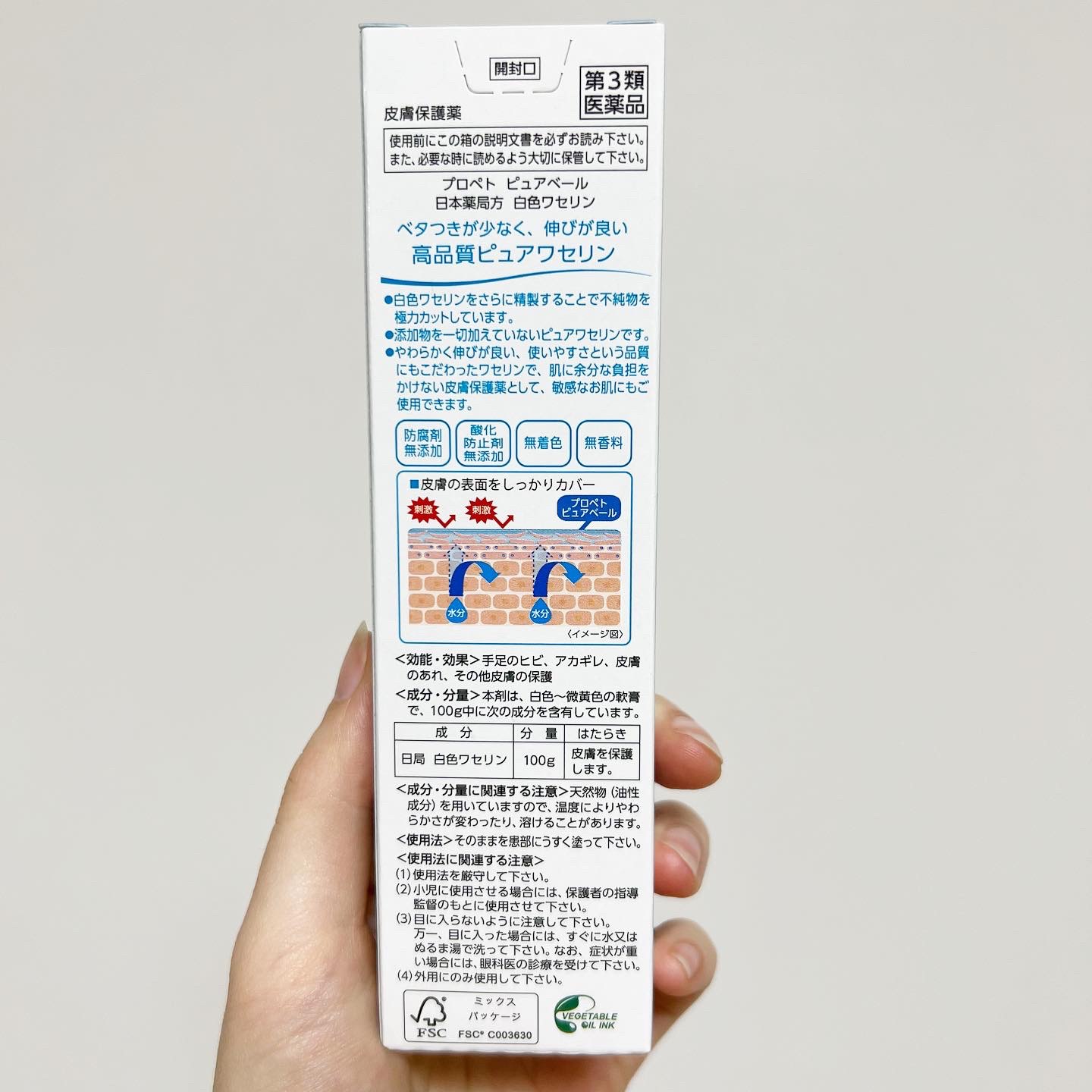 - 敏感なお肌もしっかり守る。皮膚用薬ワセリン (第3類医薬品)皮膚のあれ・その他皮膚の保護 油分が被膜となって肌を覆うことで、外部刺激からお肌をしっかり保護。白色ワセリンをさらに精製し、不純物を極力カット。添加物を一切配合していません。防腐剤、酸化防止剤、着色料、香料を無添加。 やわらかく伸びが良い高品質ピュアワセリンで、肌に余分な負担をかけません。手だけでなく、顔や目元、唇を含む全身に、敏感肌の方や肌の弱い部分にも使用いただけます。