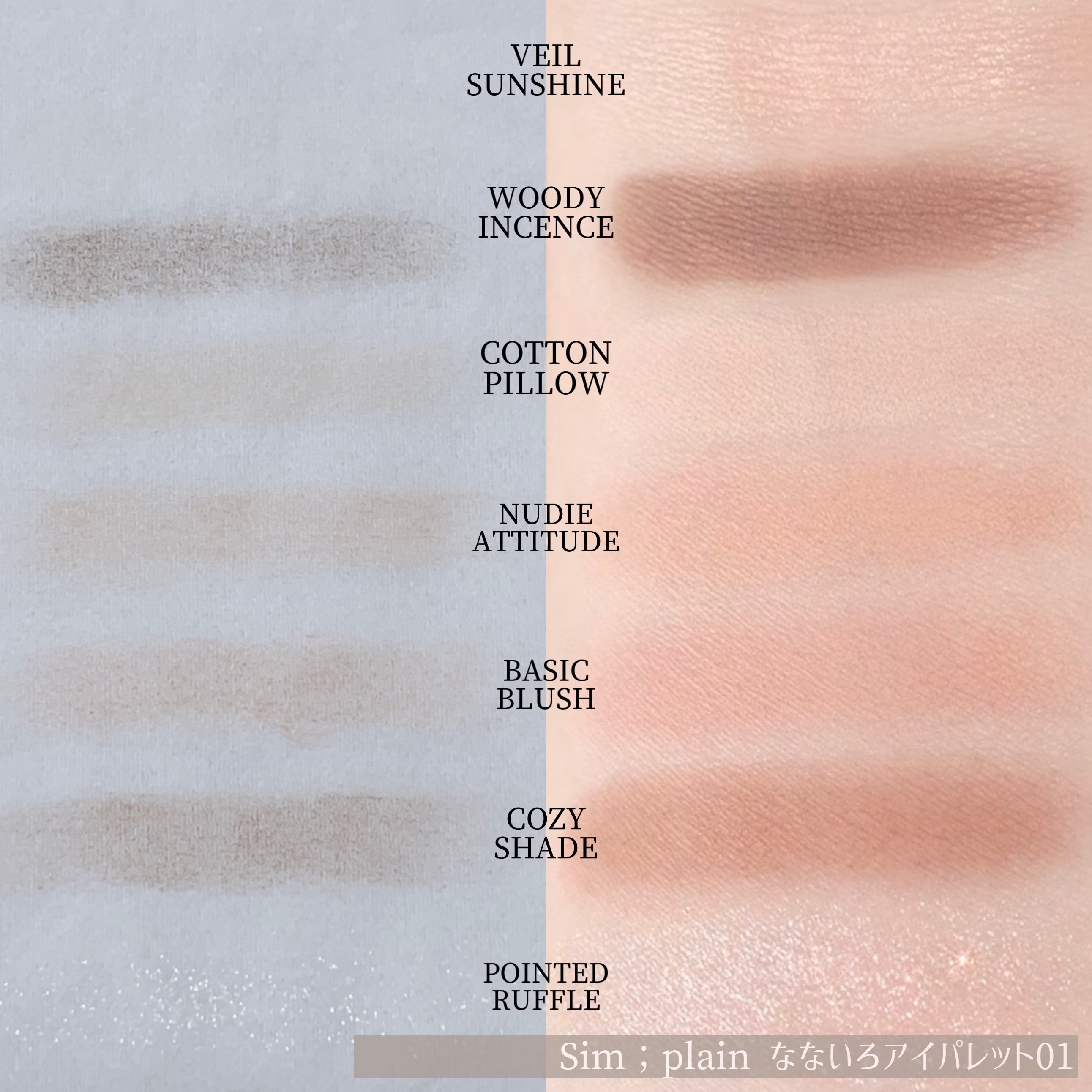 - ”感性”が日常に溶け込んだビューティーブランド”Sim;plain(シンプレイン)”。 いつもの自分にいまどきのムードを加えた、デイリーメイクアップをお届けします。 なないろのパレットは重ねるごとに透明感が増すようなレイヤリングパレットです。 柔らかく溶け込むテンダースムーズ工法のマッドシャドウとハンドメイド工法の大理石グリッターを含め、 3~4種の様々なテクスチャーで構成された7色パレットです。 <01 オフベージュ> オフベージュはゆったりとした余裕と安らぎが感じられるコーラルベージュカラー。 <02 ウォッシュドモーヴ> ウォッシュドモーヴはモーヴピンクをリネンで優しく包み込んだようなミュートタイプのピンクカラー。 <03 ニッティングコーラル> ニッティングコーラルはヴィンテージを詰め込んだソフトなコーラルカラー。 <04 パーリーグロウ> パーリーグロウは真珠のような輝きがきらめく、ニュートラルピンク。